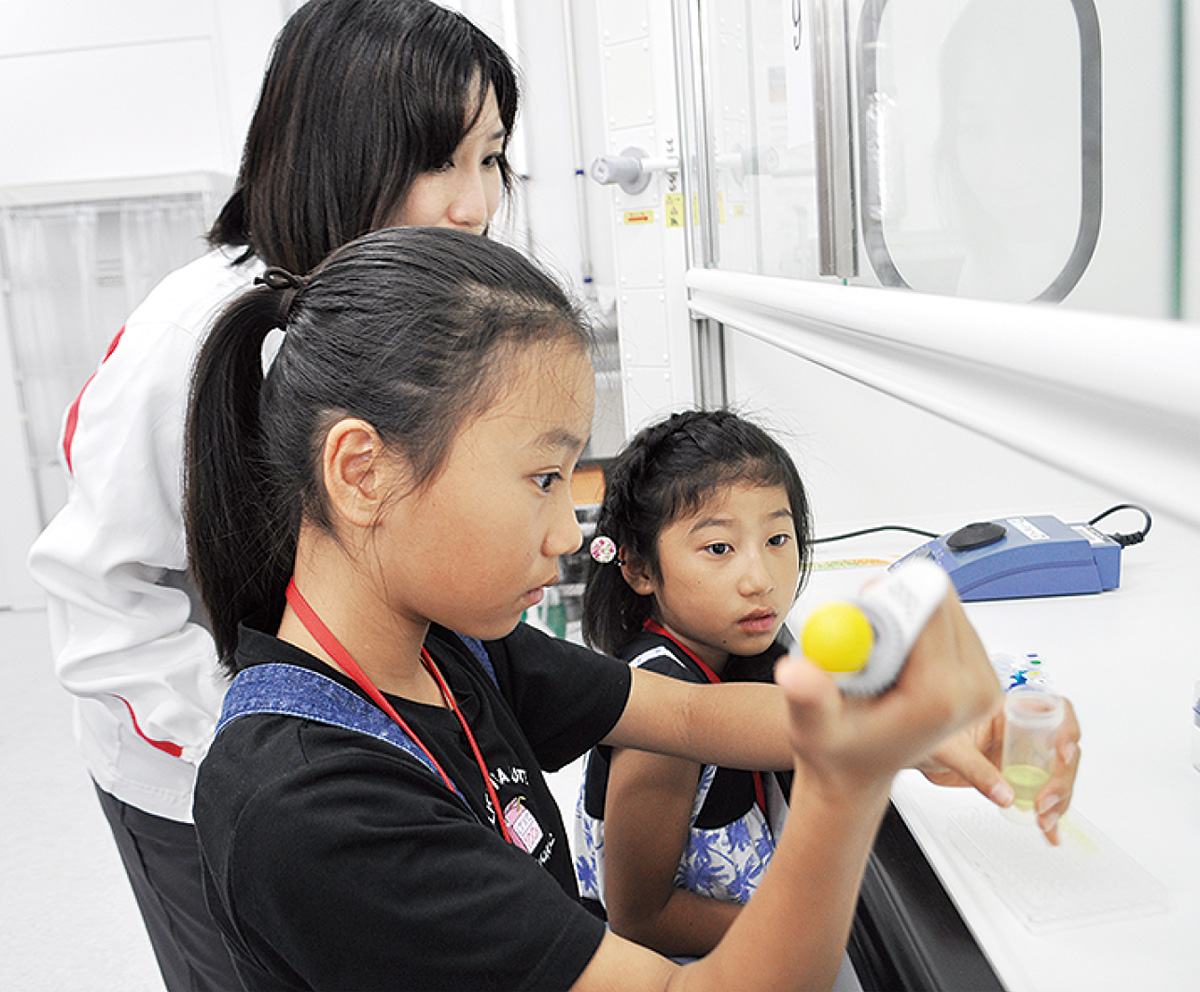創薬関連企業が入居する同施設が、科学の面白さを感じてもらおうと開催している人気講座。この日、参加者は創薬の歴史などについて講義を受けた後、実際に研究でも使われるピペットの操作やだ液中の酵素を測定する実験に取り組んだ。祖母と参加した川上唯さん(11)と玲さん(8)は溶液をピペットで移しながら「力加減が難しいけど楽しい」と笑顔だった。
