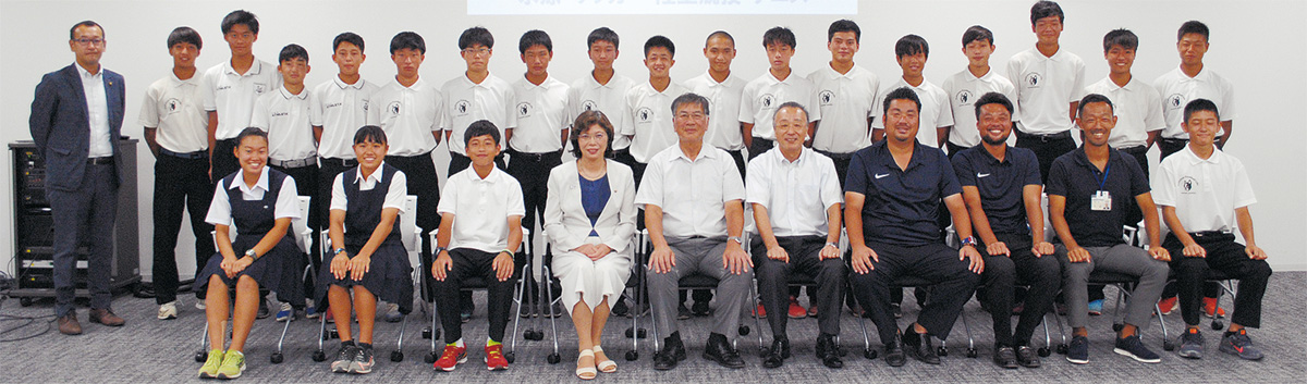 全国大会に出場する競技はサッカー、陸上、硬式テニス、水泳。大会開催中の水泳部を除く3つの部活の出場選手と鈴木校長、顧問らが市庁舎を訪れた。