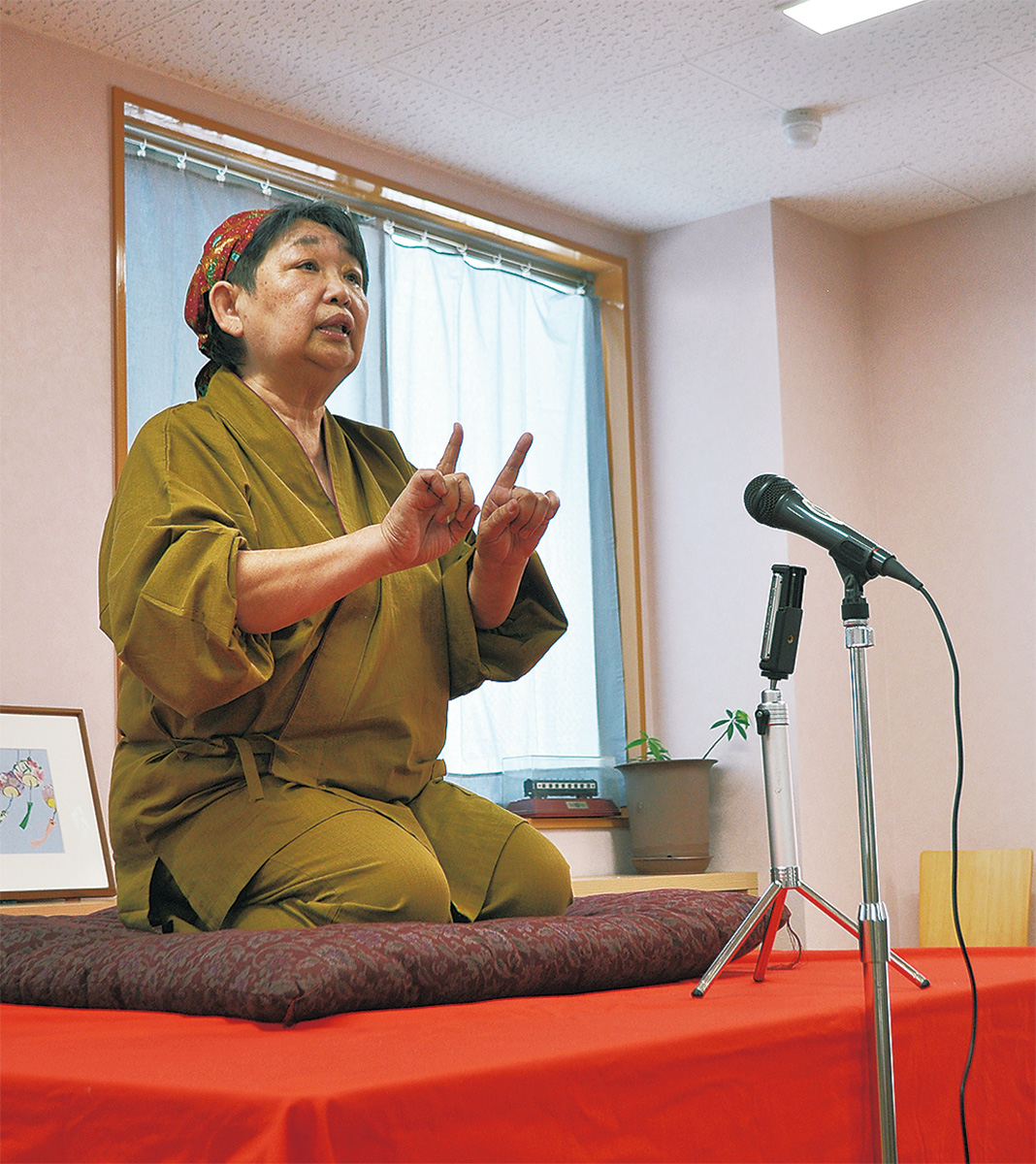 20日、渡内の「地域ささえあいセンターきらり」で催された寄席。地域住民らに得意の手話を交えながら一席を披露する川上さんの姿があった。