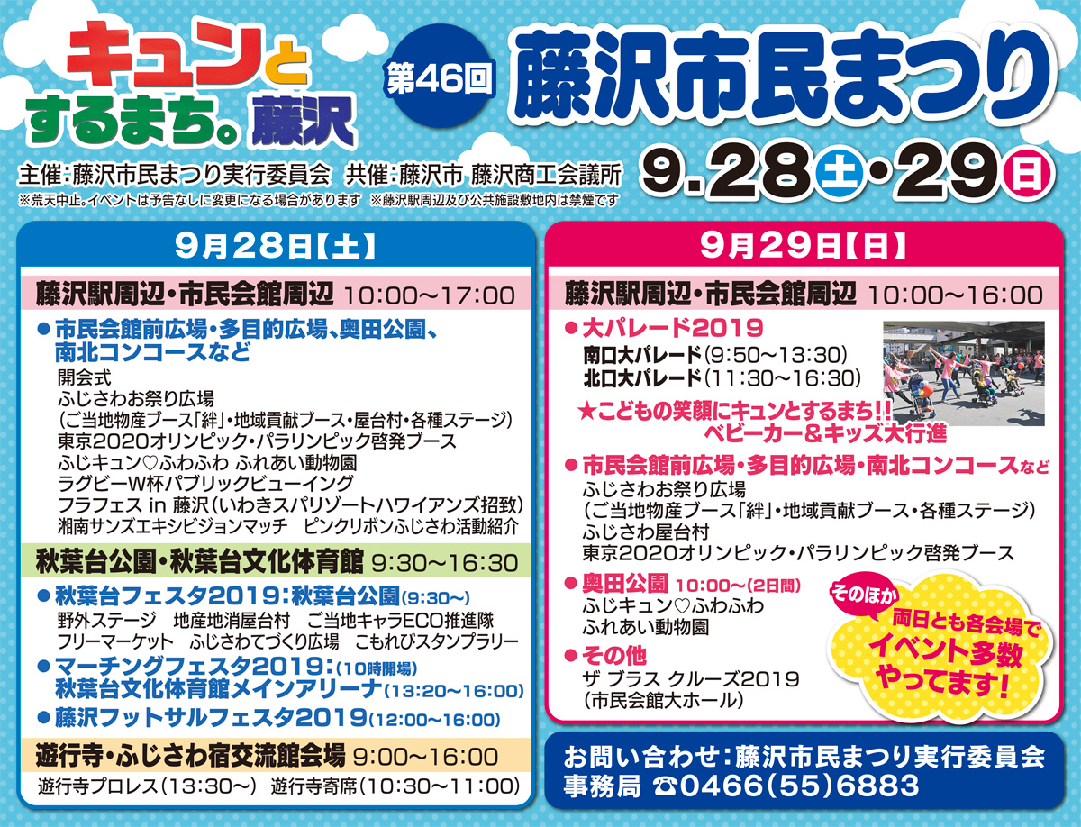 そのほか、28日(土)にはパラメダリストの若山英史さんとの車いすラグビー体験やバスケ3×3の湘南サンズエキシビジョンマッチ、ピンクリボンふじさわの麻倉未稀さん、富田京子さんのトークライブなどが開かれる。29日(日)には、「必見」と言われる迫力満点の大パレードも行われる。また秋葉台公園周辺でもステージや屋台、マーチングフェスタ、フットサルイベントが開催される。「地元の熱い2日間をぜひ楽しんで」と実行委。