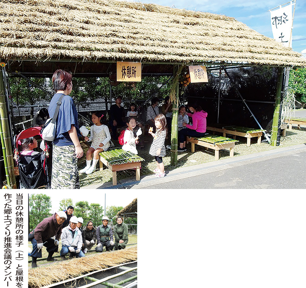 なかでも一際目立つのが、わらぶき屋根の休憩所。郷土づくり推進会議のメンバーらが「御所見地区ならではの文化祭にしよう」と5年程前に発案し、7〜8人のメンバーが手作業で、一から作成している。材料は、隣町の遠藤から竹を、打戻の米農家からわらを調達。約60本の竹と軽トラック1台分のわらを重ね合わせ、横約6m×縦約2・5mの一枚の屋根を作り上げる。同会議長の井出隆夫さんは「造園や農家の知識や技術を持ったメンバーが集まっているからできること。御所見の雰囲気にも合っているでしょ」と笑顔で話す。
