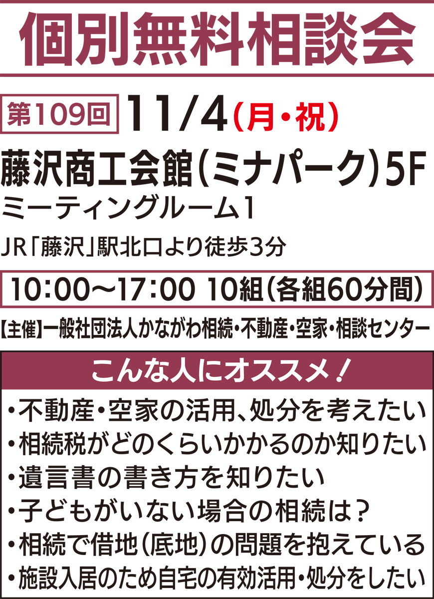 相続の基礎知識から対策、不動産問題(物件売買・借地・空き家の処分等)の困りごとや悩みを整理し、その場ですべての相談内容に「ワンストップ」で対応。無料相談会では、相続、不動産関係以外にも老後資金対策や高齢者施設への住み替えなど、最適かつ確実にアドバイスする。