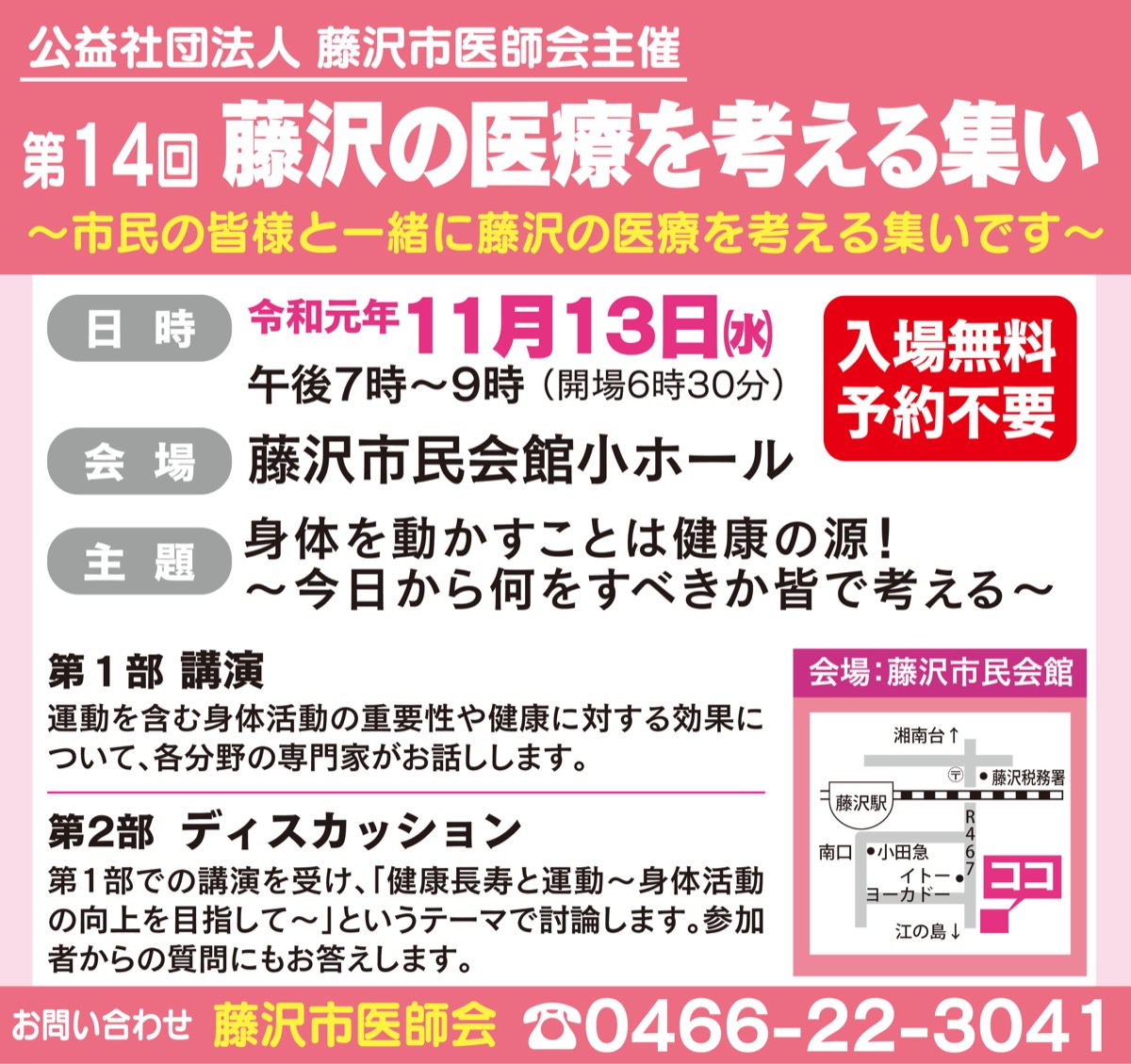 医師による講演とディスカッションがあります。講演では、糖尿病や認知症など、専門知識のある医師が登壇し、病気と身体を動かすことの関係についてお伝えします。藤沢市が取り組んでいる身近な情報も紹介します。またディスカッションでは、健康寿命の延伸について話し合いながら、来場者の方々からの質問にお答えします。この機会に普段から気になっている疑問や悩みなど、お寄せ下さい。