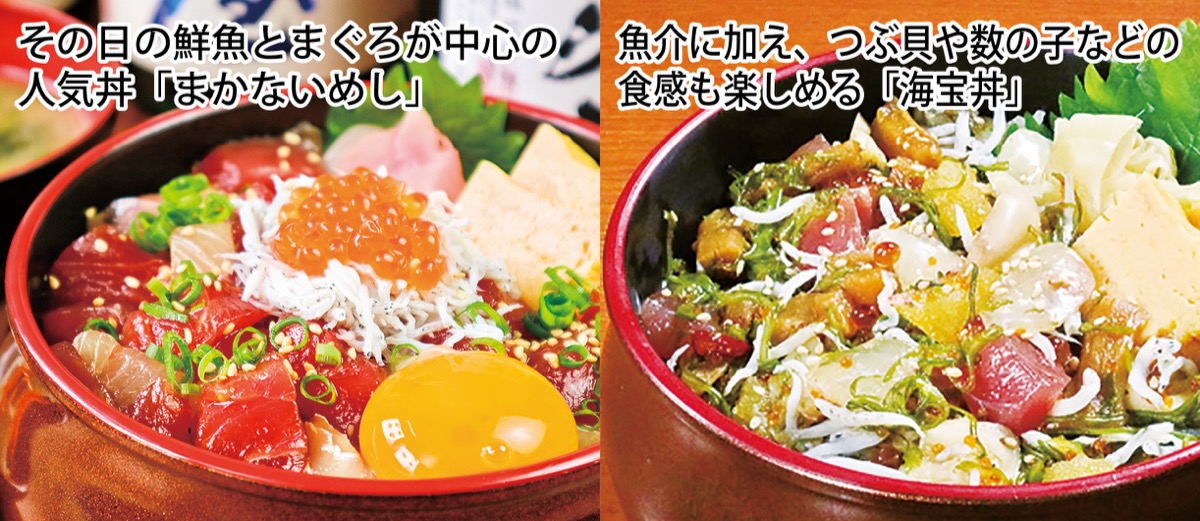 特製ダレで漬け込む丼「まかないめし」と「海宝丼」が通常1380円のところ、12月6日(金)までクーポン持参で1千円に。どちらも地元鮮魚などをふんだんに使う逸品なので、この期間をお見逃しなく※表記は税別、クーポン1枚でグループ全員対象■生ビール390円&サワー300円、各種宴会コース有