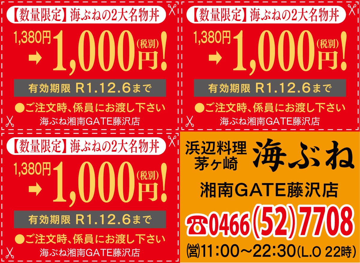 地元市場直送の素材による漁師料理が人気の「茅ヶ崎海ぶね」湘南GATE藤沢店が名物丼2種を特価で提供する。