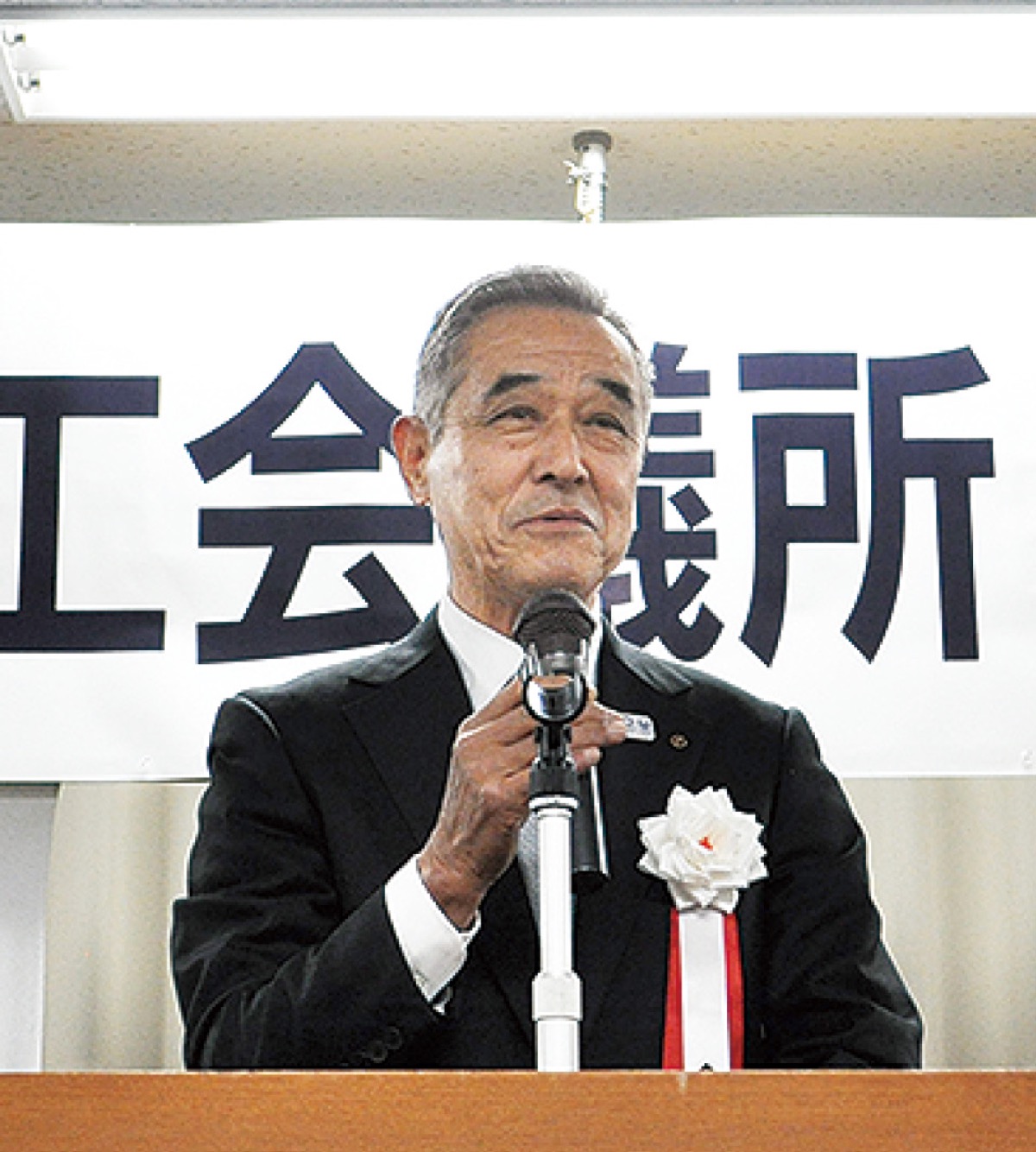 あいさつに立った増田会頭=写真=は「長年に渡り市内経済の発展に尽力、貢献してくださったことに感謝」などと、被表彰者に賛辞を贈った。