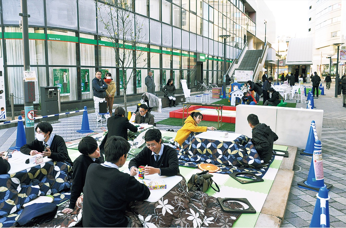 この日は通りがかった学生がこたつで暖まったり、子どもが芝生で遊んだり。子連れで足を運んだ30代の女性は「新しい憩いの場が生まれることで交流の輪も広がる。こういうイベントはいいと思う」と話した。
