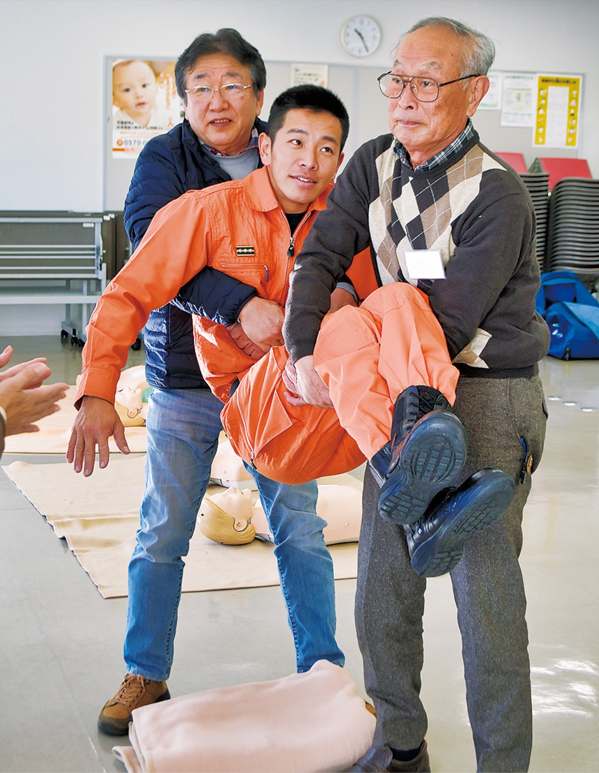 隊員は、運ばれる人の足をクロスさせることで安定させる方法や、毛布など手近な道具を活用するなど、実際の救助の際にも行う事例を交えながらコツを伝授。参加者は「実際にやってみないとわからないことばかりだった。身近な病人の有無に関わらず、広く知ってほしい」と話した。