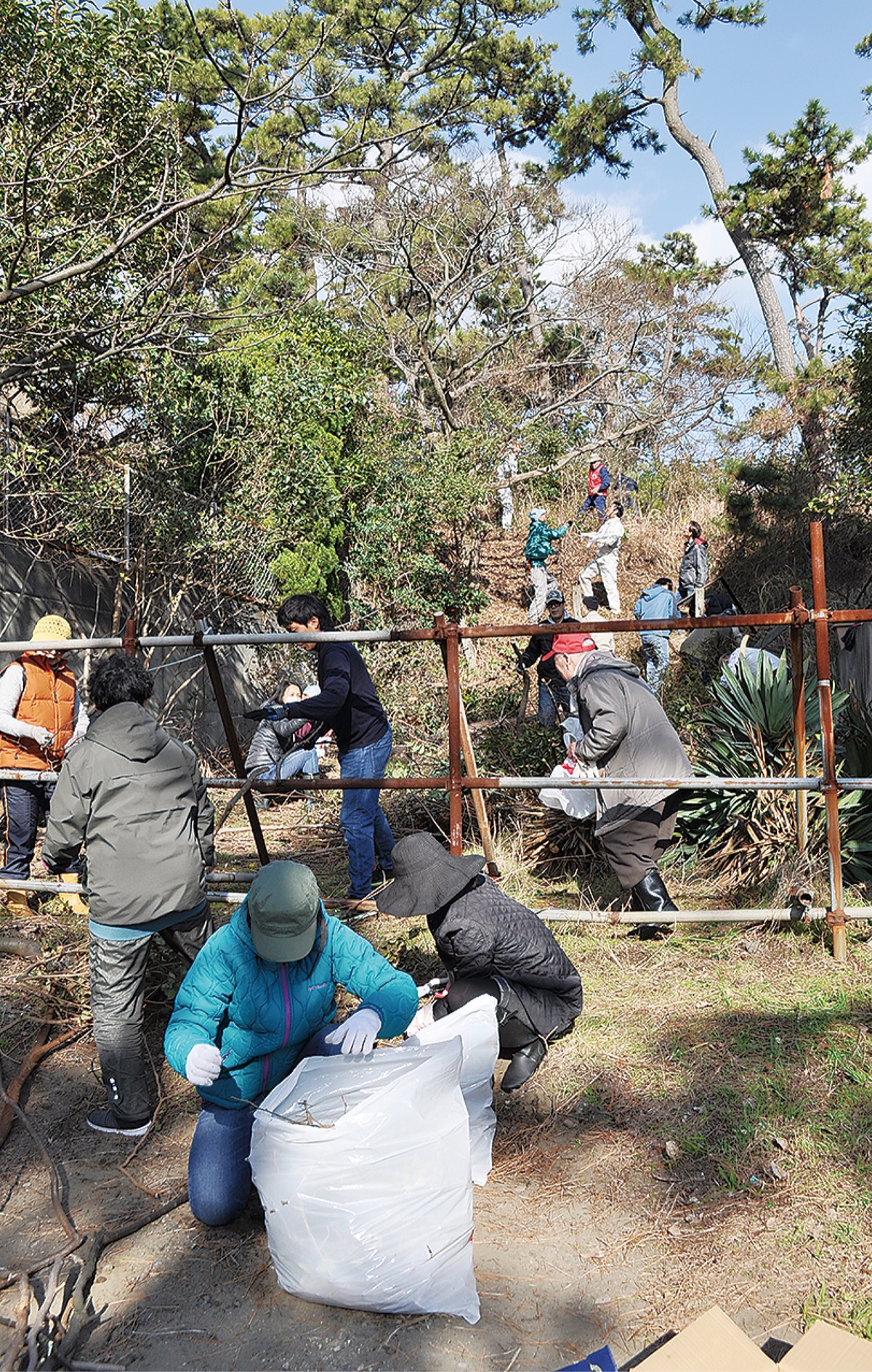 当初は市に公園整備を求める案もあったが、実現が難しいことから住民自らが作業することに。この日は地域住民や市関係者など約30人が参加。下草や避難路の妨げになる木や枝を剪定するなどし、汗を流した。