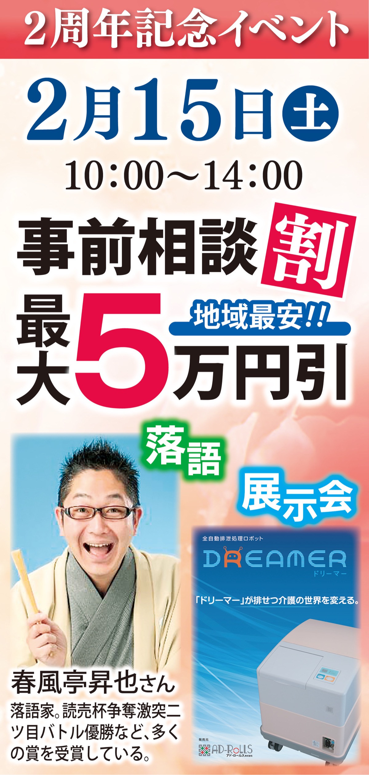 「頼れる家族のひとりとして」をコンセプトに、これまで多くの葬儀を行ってきた「セレモニーホールえにし」(辻堂元町4の8の10)が創業2周年を迎え、2月15日(土)に記念イベントを開催する。午前10時から午後2時。参加無料。