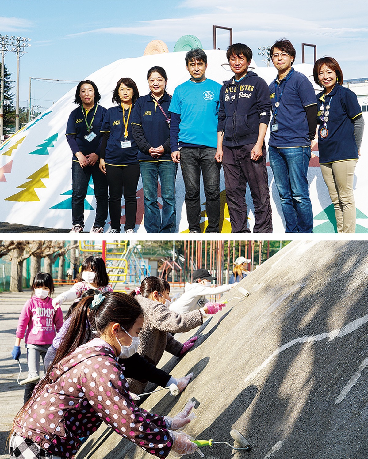 修繕は滑り台やコンクリート部分の補修、防水処理などを施工。今月に入り、児童が塗装作業に参加した。デザインは篠崎校長を中心に教職員が「子どもも塗装しやすいように」とアイデアを絞り、4色の杉をモチーフに仕上げた。