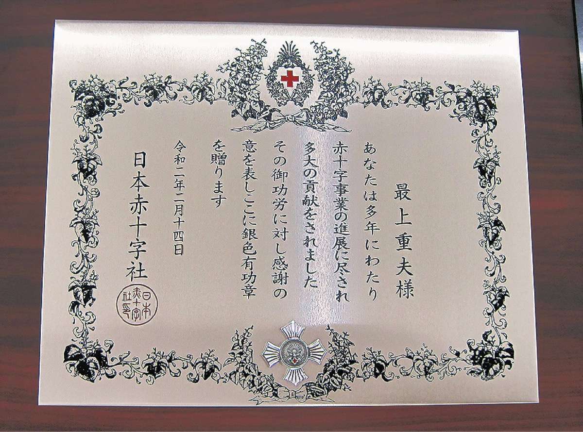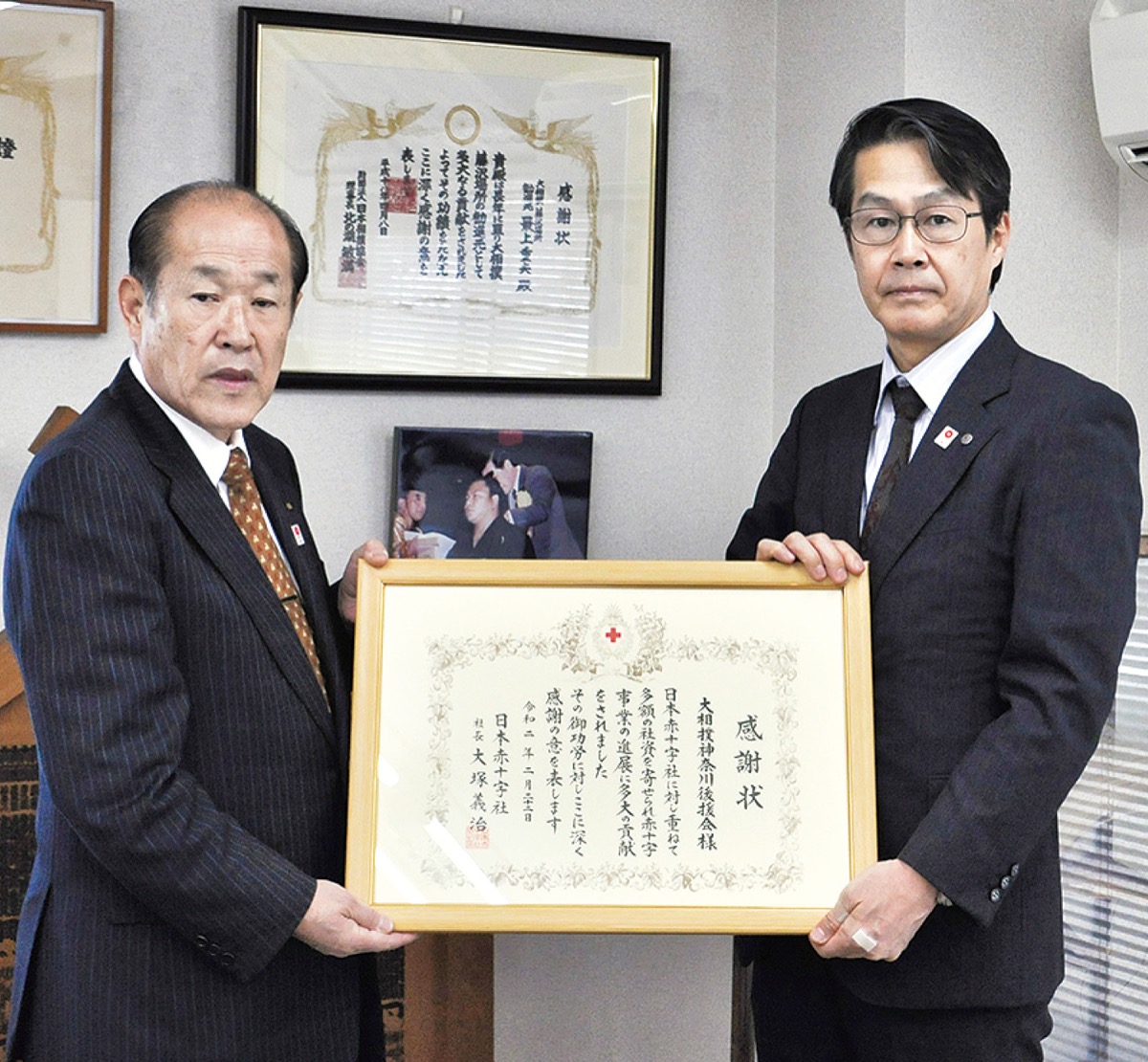 日赤本社の代議員として、また神奈川県支部の評議員として運営に貢献してきた地元(株)湘南営繕協会社長の最上重夫氏(70)が、銀色有功章を受けた。また、同社が事務局を務める大相撲神奈川後援会に対して同時開催の献血キャンペーン活動などが高く評価され、感謝状が贈られた。