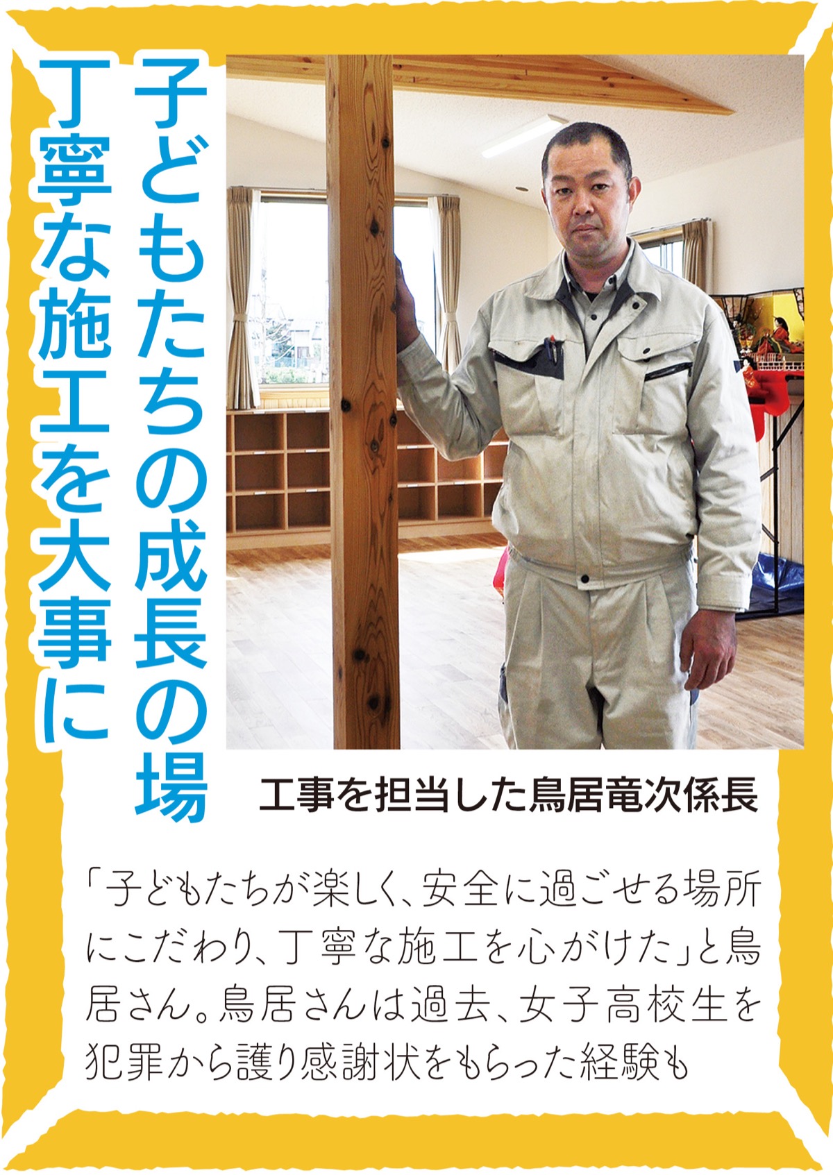 施工を任された同社工事部係長の鳥居竜次さんは出来に「満足してもらえると思います」と自信をのぞかせるとともに、「地域のお子さんたちの想い出の場所として記憶に残る建物になれば」と目を細めた。