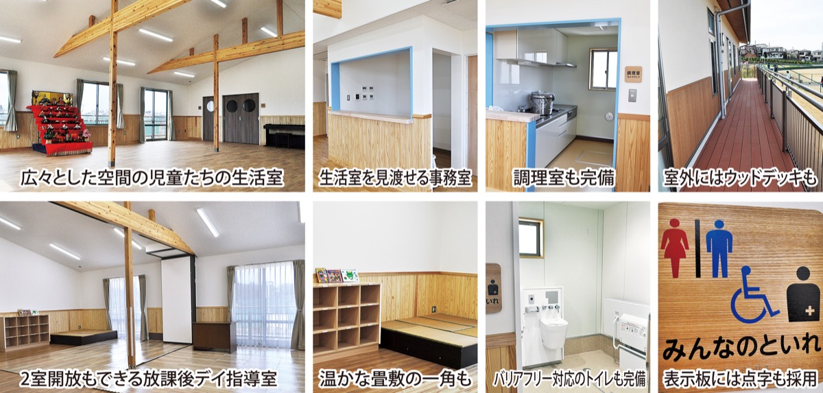 同施設は延床面積約240平方メートル、1階建て。内部は大きく2つに分かれており、放課後児童クラブエリアと放課後デイ、障がい児者一時預かりエリアに分かれている。