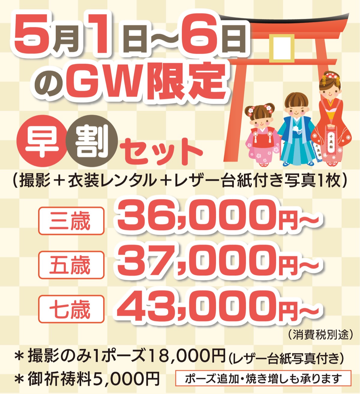 鵠沼伏見稲荷神社内の写真室では、5月1日から6日のゴールデンウィーク期間限定で、七五三撮影の「超々早割お得プラン」を用意している。同神社内でプロの写真家が撮影。今なら、御祈祷の様子と境内の千本鳥居前での撮影等がサービスで付いてくる。