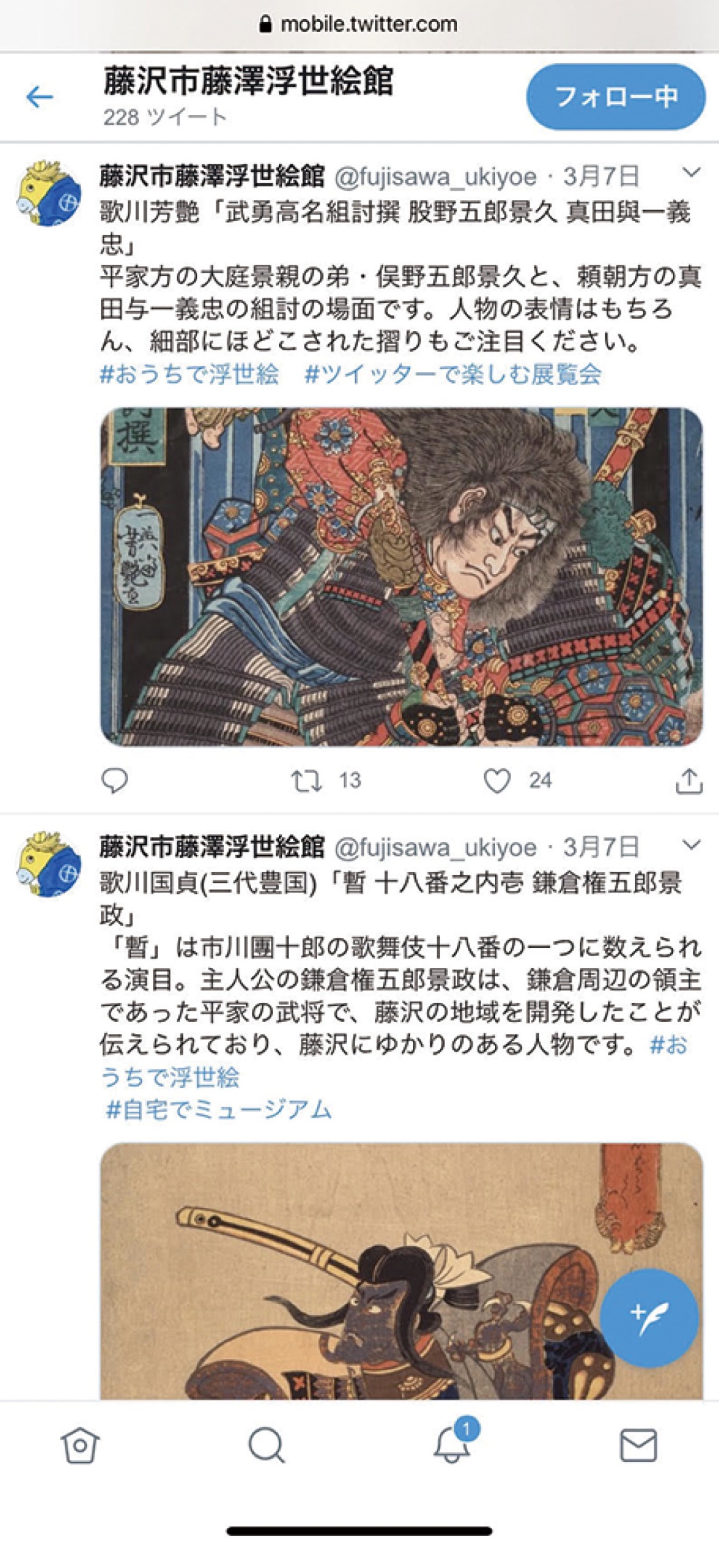 辻堂神台にある藤澤浮世絵館がSNSを使った作品紹介に取り組んでいる。「#(ハッシュタグ)おうちで浮世絵」をつけ、収蔵する浮世絵を学芸員がワンポイント解説。新型コロナウイルスの影響で休館状態が続くが「直接ご覧いただけない分、自宅で少しでも作品を楽しんでもらえたら」と話している。