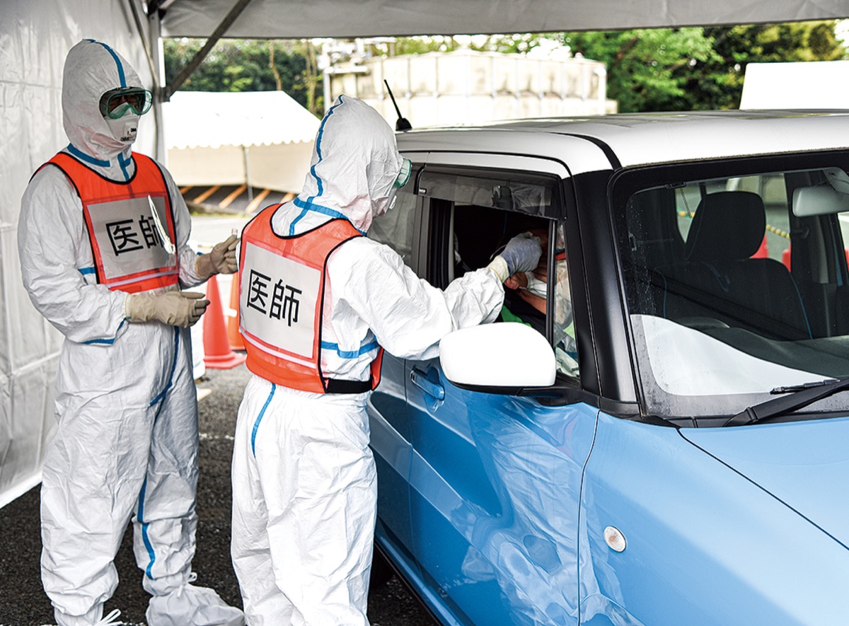 新型コロナウイルス感染拡大の影響を受け藤沢市は先月27日から、車に乗ったまま受ける「ドライブスルー方式」のPCR検査を開始した。県内では初めて。保健所職員や医療従事者の負担を軽減しつつ、検査体制の強化を図る。同日、検査の手法などを説明するデモンストレーションが報道関係者向けに行われた。