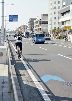 海岸沿いの国道134号線を中心に青い矢羽根型の路上表示=写真=が出現している。自転車愛好家にはお馴染みのマークで、国や県が推進するサイクリングロード構想「太平洋岸自転車道」整備の一環だ。
