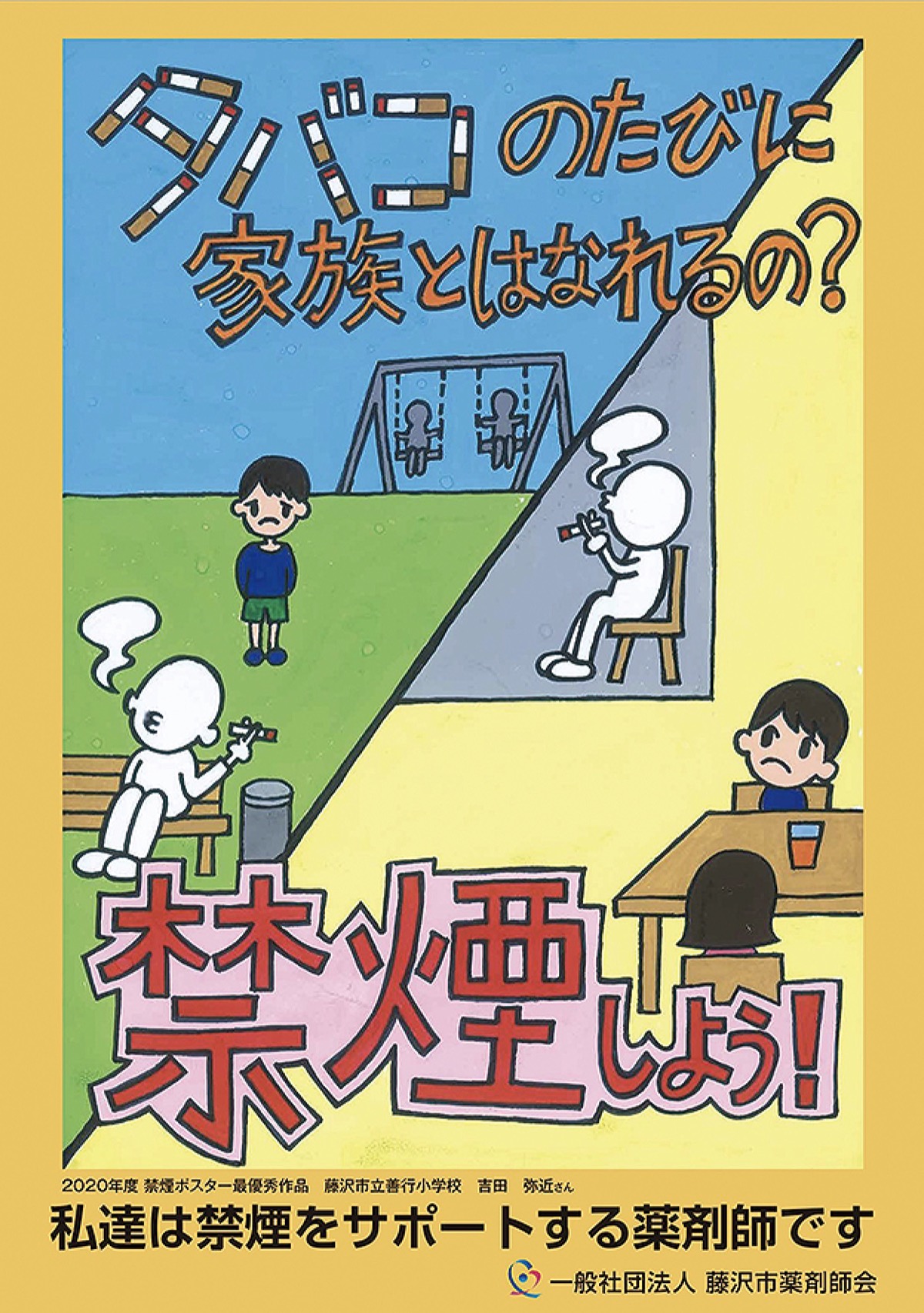 藤沢市薬剤師会(齊藤祐一会長)が主催する禁煙ポスターコンクールの最優秀賞に選ばれた善行小学校5年の吉田弥近さんの作品がポスター化され、市内の薬局約140店で展示される。