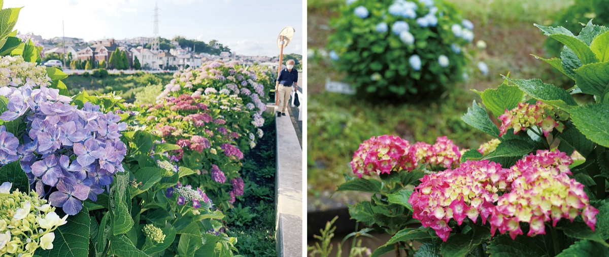 慶応大学湘南藤沢キャンパス南側にある「花とせせらぎの道」(えびす橋から大黒橋までの約500m)でも、アジサイが咲き始めている。遠藤あじさいの会(河野勝会長)が20年以上に渡り手入れをしているもので、小出川の両岸に水色やピンクなど約500株が咲き誇る。