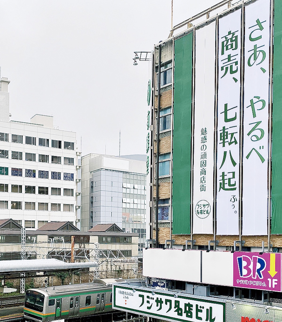 新型コロナウイルスの影響で外出自粛が続く中、SNS上などで話題を集めたフジサワ名店ビルの懸垂幕。同ビルの営業再開に合わせ、1日から新たなメッセージがお目見えした。「さぁ、やるべ 商売、七転八起 ふぅ。」と書かれた幕=写真=が道行く人や駅利用者の目を引いている。