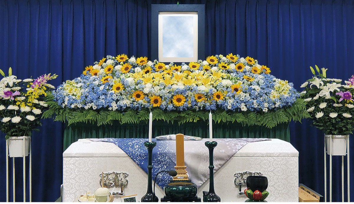 記者―家族葬と言えば平和堂では25年も前の「家族葬」と言う言葉も無い時から「ファミリープラン」として、現在の「家族葬」を実施している。オリジナルの花祭壇も大好評だ。この時期はひまわり祭壇の依頼が多いらしい。お別れで棺の中をひまわりで埋めればさみしさも和らぐかもしれない。
