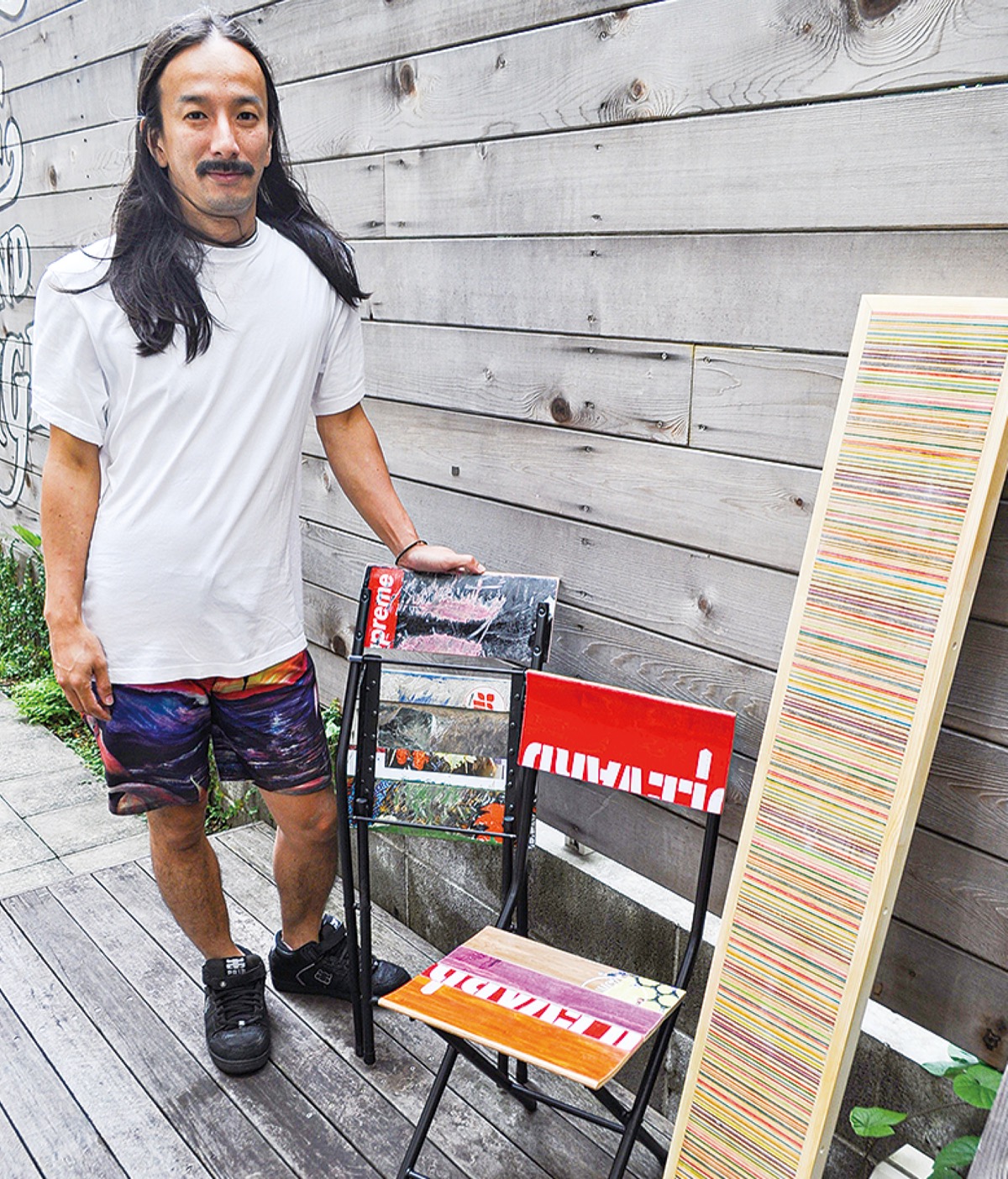 スケートボードの廃材を使って、テーブルや椅子などの家具、額縁、アクセサリーなどの作品を作っている人がいる。山崎元弥さん(36)=鎌倉市在住。1年半ほど前から趣味として始め、これまで80点以上の作品を制作。勤務先のカフェ「8ラウンジ」(鵠沼花沢町)や知人との個展で展示するなど活動の幅を広げている。