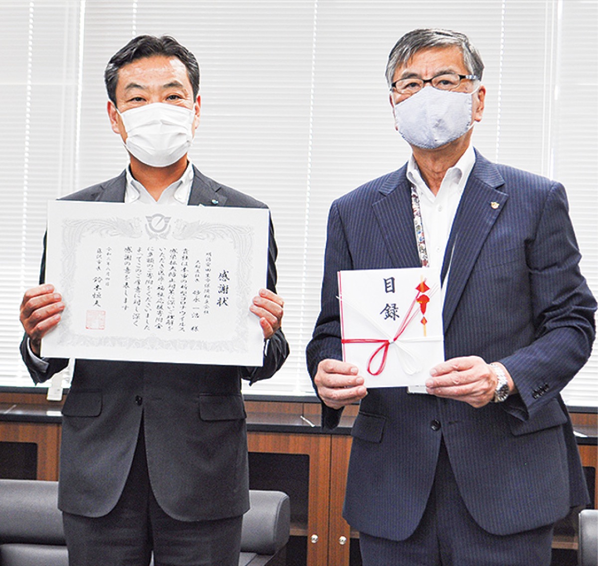 市と同支社は昨年9月に市民の健康増進に関する連携協定を締結した経緯がある。目録を手渡した砂永一浩支社長は「医療従事者や子どもなど、コロナ禍の影響を受けている人たちのため有効に役立ててもらえたら」と話し、鈴木恒夫市長は「予断を許さない状況が続くが、応援いただくことは大変励みになる」と謝辞を述べた。