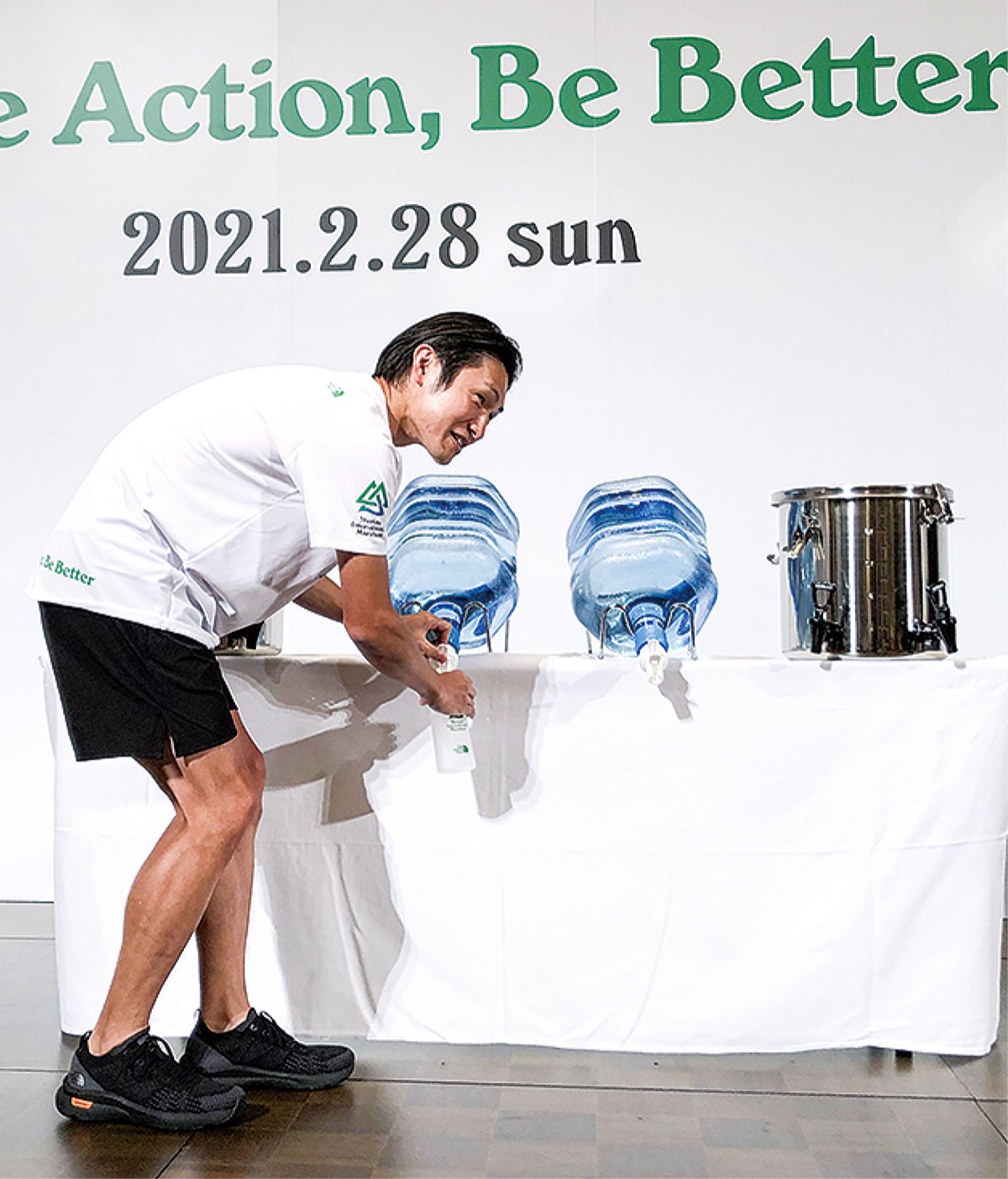 大会名誉会長の河野太郎さんは「ただのスポーツイベントではなく、ゴミを出さない大会を目指す。世界で最初のマイボトルランナーになりましょう」と呼びかけた。
