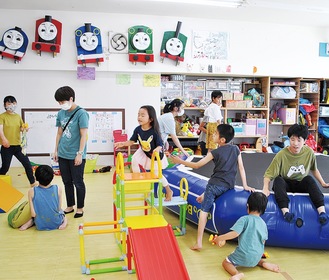 辻堂団地の一角、広さ約200平方メートルのガラス張りの建物に入ると、大きなトランポリン、色とりどりのブロックなど遊具やおもちゃがずらり。子どもたちが自由に走り回り、笑い声が響き渡る。