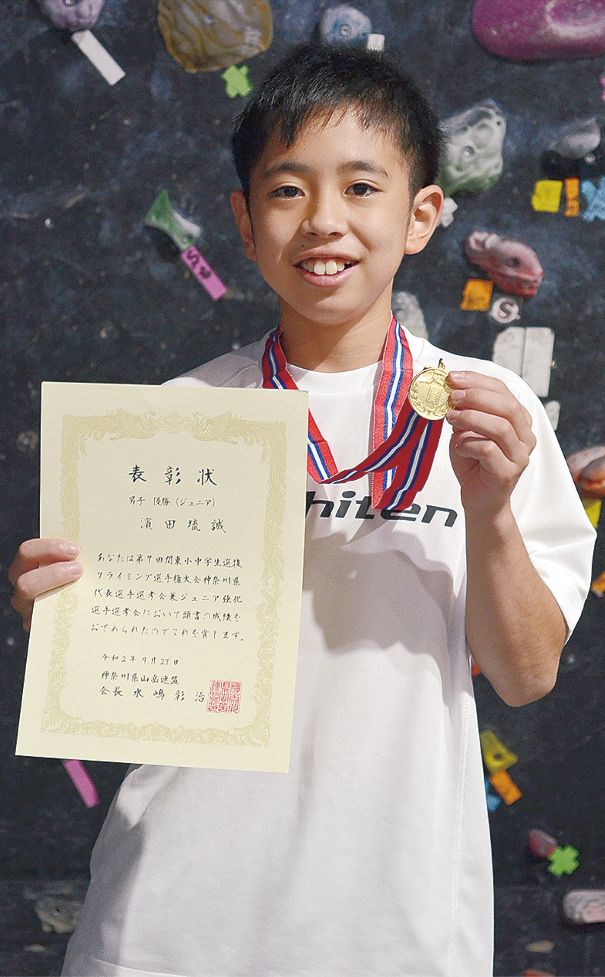 大鋸小学校6年生の濱田琉誠(りゅうせい)君が、先月27日に開かれた「関東小中学生選抜クライミング選手権大会 神奈川県代表選考会」で男子優勝を果たした。次の舞台は11月29日の関東大会。今年度の県山岳連盟のジュニア強化指定選手にも選ばれ、さらなる飛躍が期待される。