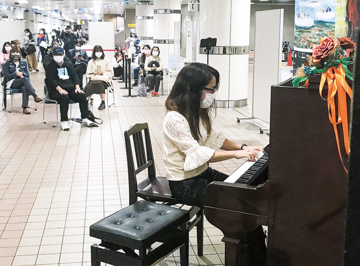 湘南台駅地下広場で23日、「湘南台アートスクエアライブ」が開催され、プレイベントとして市内在住の作曲家でピアノ演奏系ユーチューバー「あさぴ」こと朝香智子さん=人物風土記で紹介=がストリートピアノを演奏した。