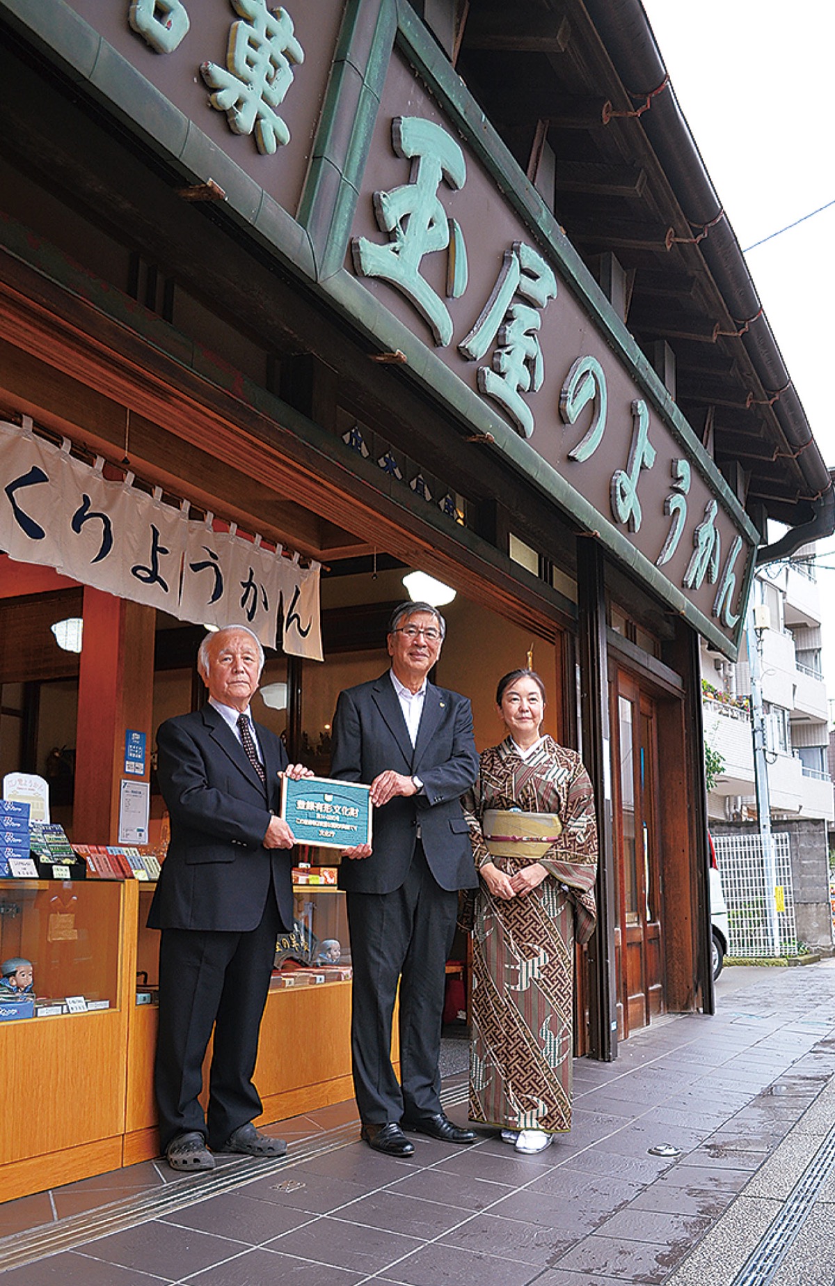 今年4月に国登録有形文化財に指定された洲鼻通り沿いの老舗和菓子店「玉屋本店」(片瀬海岸)の店舗兼主屋にこのほど、文部科学大臣から登録証と記念プレートが交付された。23日に片瀬市民センターで開かれた伝達式で鈴木恒夫市長から店主の依藤光雄さんに登録証などが手渡され、店舗で見学が行われた。