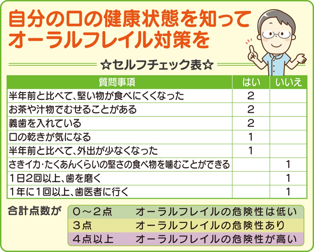 オーラルフレイルの始まりの症状は、ささいな症状で、見逃しやすいのが特徴。藤沢市歯科医師会の関根顕専務理事によると、藤沢市では65歳以上の高齢者の約25%は、オーラルフレイルの症状に該当するという調査結果が出ているという。その症状に早く気付き、予防や改善をすることが必要。定期的に歯や口の健康状態を歯科医師に診てもらうことが大切だ。