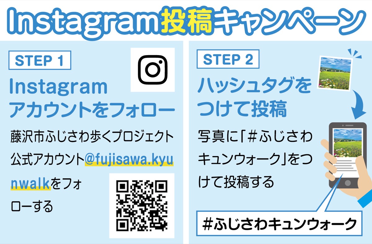 インスタグラム投稿キャンペーンは、同PJ公式アカウントをフォローし「#ふじさわキュンウォーク」のハッシュタグを付けて投稿してもらう。市は、思わず歩いて行ってみたくなるような地元の魅力的な写真を募っている。