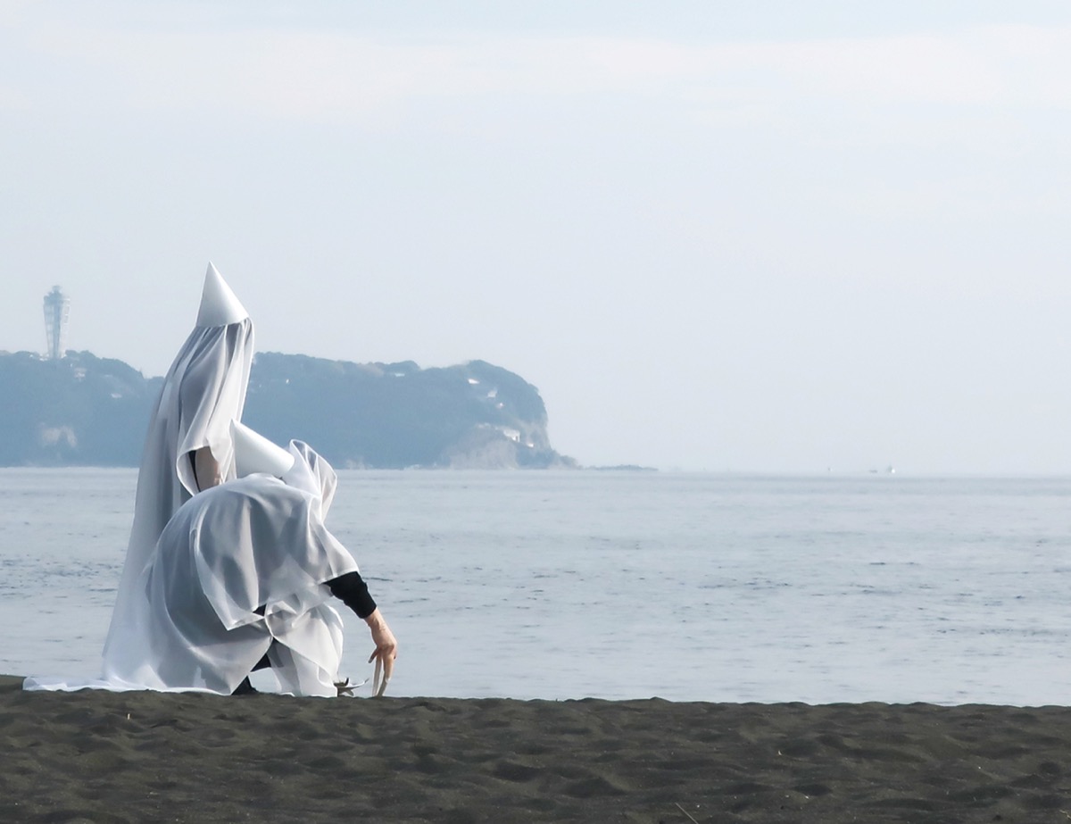 生命は巡り、すべては海へ――。辻堂海岸に12日、一風変わった鳥に扮したの集団が現れ、砂浜で貝などの漂着物を拾うビーチコーミングを行った。若手アーティストの尾崎藍さんの「生命の循環」などをテーマとした映像作品制作の一環で、藤沢市アートスペースが企画した。三角帽子と白いマントを身にまとい、指には鳥の手を模した長いつけ爪。事前公募で集まった約10人の参加者らの姿を、海岸を訪れた一般人は物珍しそうに眺めていた。作品は同スペースで1月30日から3月21日に開催予定の展覧会「Artists in FAS 2020」で公開予定。