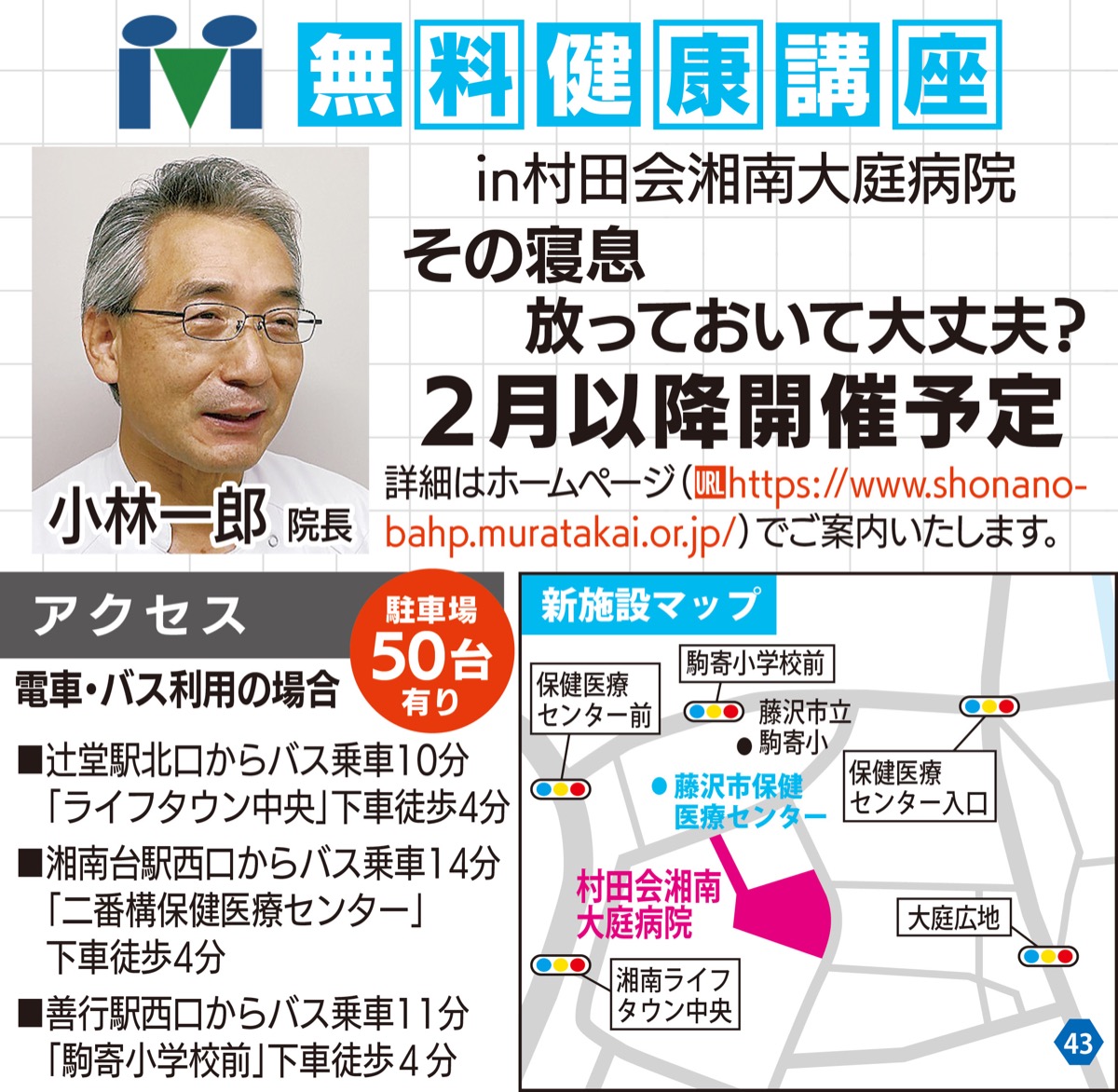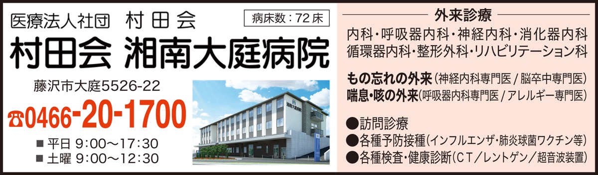 大庭の保健医療センターそばに昨年オープンした「村田会湘南大庭病院」では2月以降に、「睡眠時無呼吸症候群を知ろう」と題した無料健康講座の実施を予定している。講師は小林一郎院長。睡眠時無呼吸症候群が、高血圧や糖尿病、メタボとの合併が高いことや、脳血管障害や心血管疾患の死亡リスクが高まること、集中力や意欲が低下し、うつ病に類似した症状を引き起こすことなど、詳しく教えてくれる。詳細は同院ホームページで確認を。