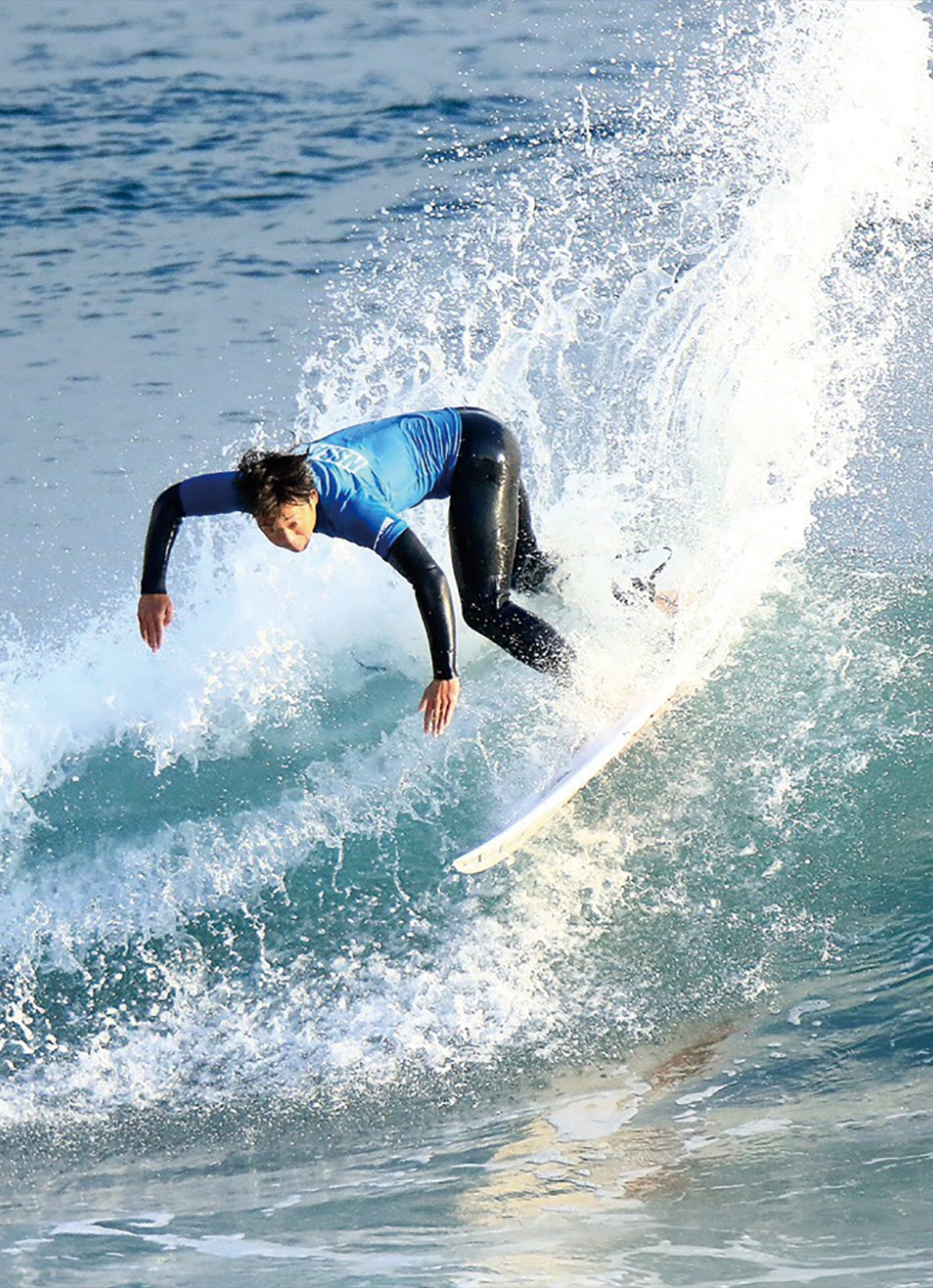 「久しぶりに試合ができる。とにかく楽しんでいこう」。当日は波が安定せず恵まれたコンディションではなかったが、予選から波を見極め、決勝ではプロに入り混じって4人中2位の好成績でフィニッシュ。「今まで練習してきたものが出せた。後輩たちにも背中が見せられたかな」と振り返ってはにかむ。