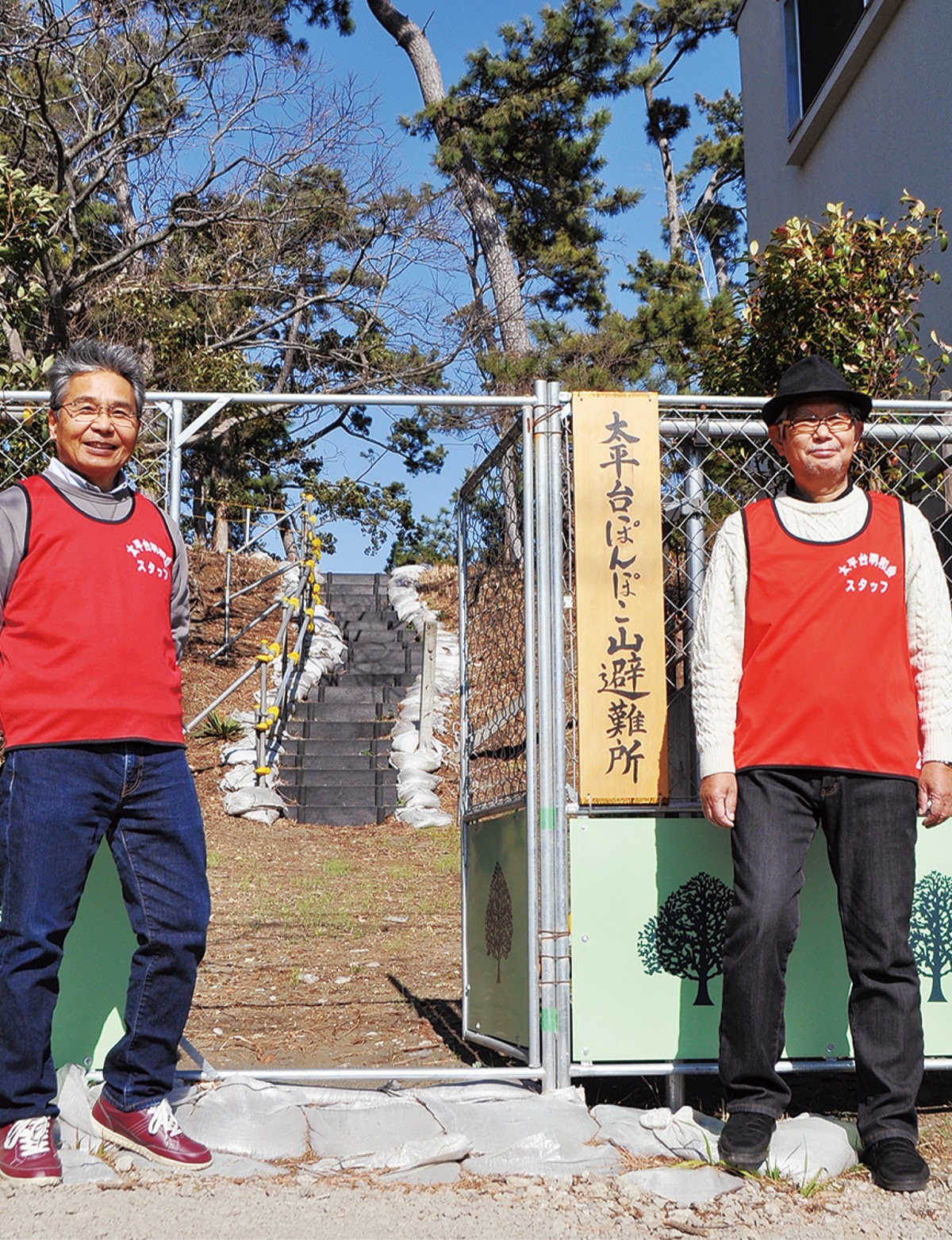 昨年10月に完成した「太平台ぽんぽこ山避難所」。地区内では最も標高が高い場所に300平方メートルほどのスペースが確保され、津波警報発令時には約150人が避難できる。元々はやぶが生い茂る空き地だったが、土地所有者の了解を得た上で住民や市職員らが伐採し、緊急時に一時避難できる場所として整備した。