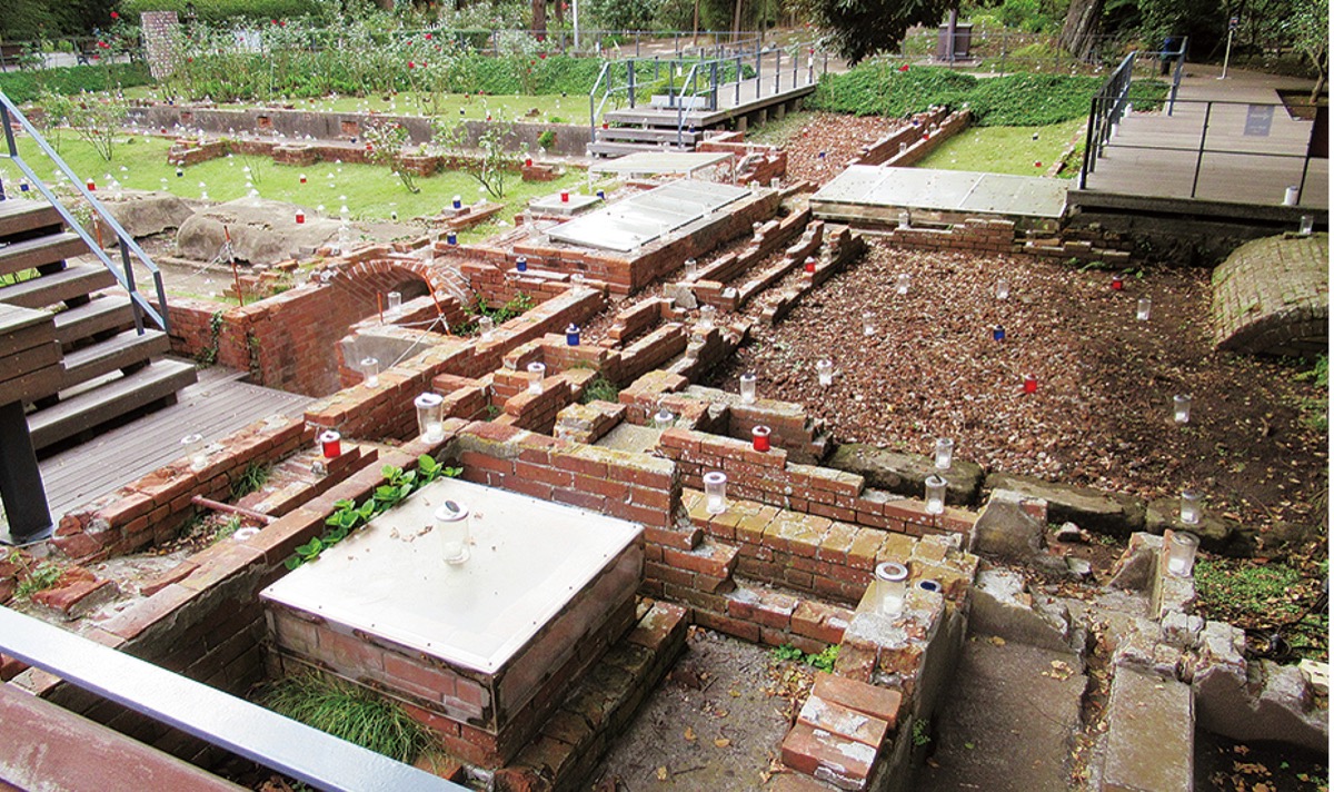 同苑前身の庭園は、英国の貿易商、サムエル・コッキングが私財を投じて1885(明治18)年に完成。温室遺構は2002年の改修工事の際に発見されたもので、基礎部分のほか、地下貯水槽などが残る。市観光シティプロモーション課によると、レンガ造りの温室遺構としては現存する唯一のものという。