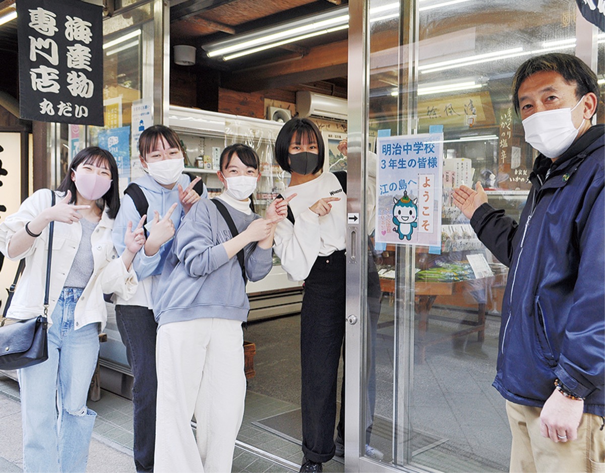 「少しでも江の島散策が楽しい思い出になれば」。先月22日、コロナ禍で中止になった修学旅行の代わりに、江の島でフィールドワークをする明治中学校3年生に対し、同島事業者有志が歓迎ムードを演出した。