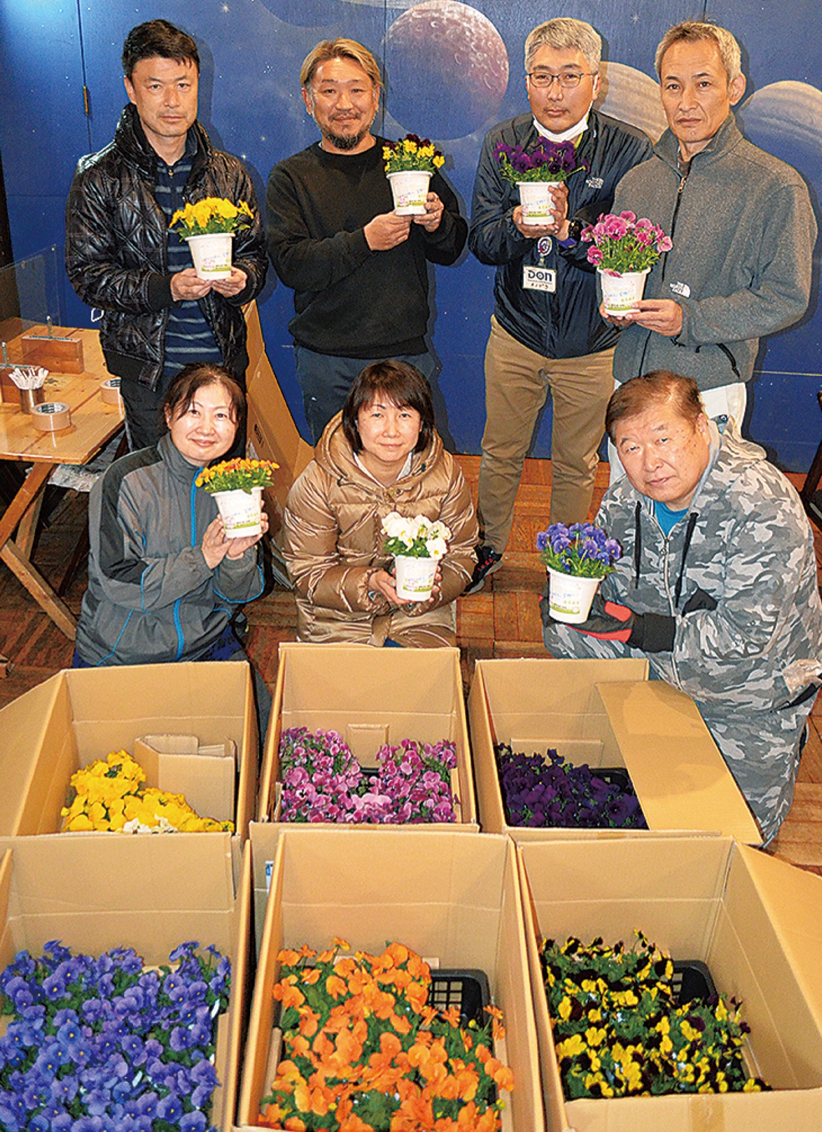 今年も3月に入ると、同会メンバーは6日の鳴瀬第一中学校(現・鳴瀬みらい中学校)の卒業式に向けて発送準備を開始。「DON(どん)なときも笑顔で」のメッセージが添えられたオレンジやピンク、黄色など色とりどりのビオラ約70株の、箱詰め作業に奮闘した。