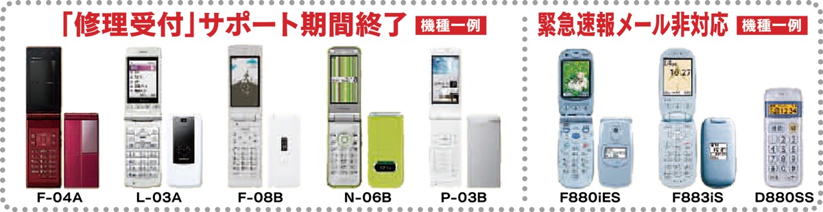 秒読みは始まっている。NTTドコモの場合、2000年から一世を風靡した「FOMA(フォーマ)」が画面割れやボタンの反応が悪くなった時の修理受付サポートが終了。すでに故障したら修理できないのが現状だ。また、ガラケーには災害時に気象庁などが配信する「緊急速報メール」非対応の機種も少なくない。