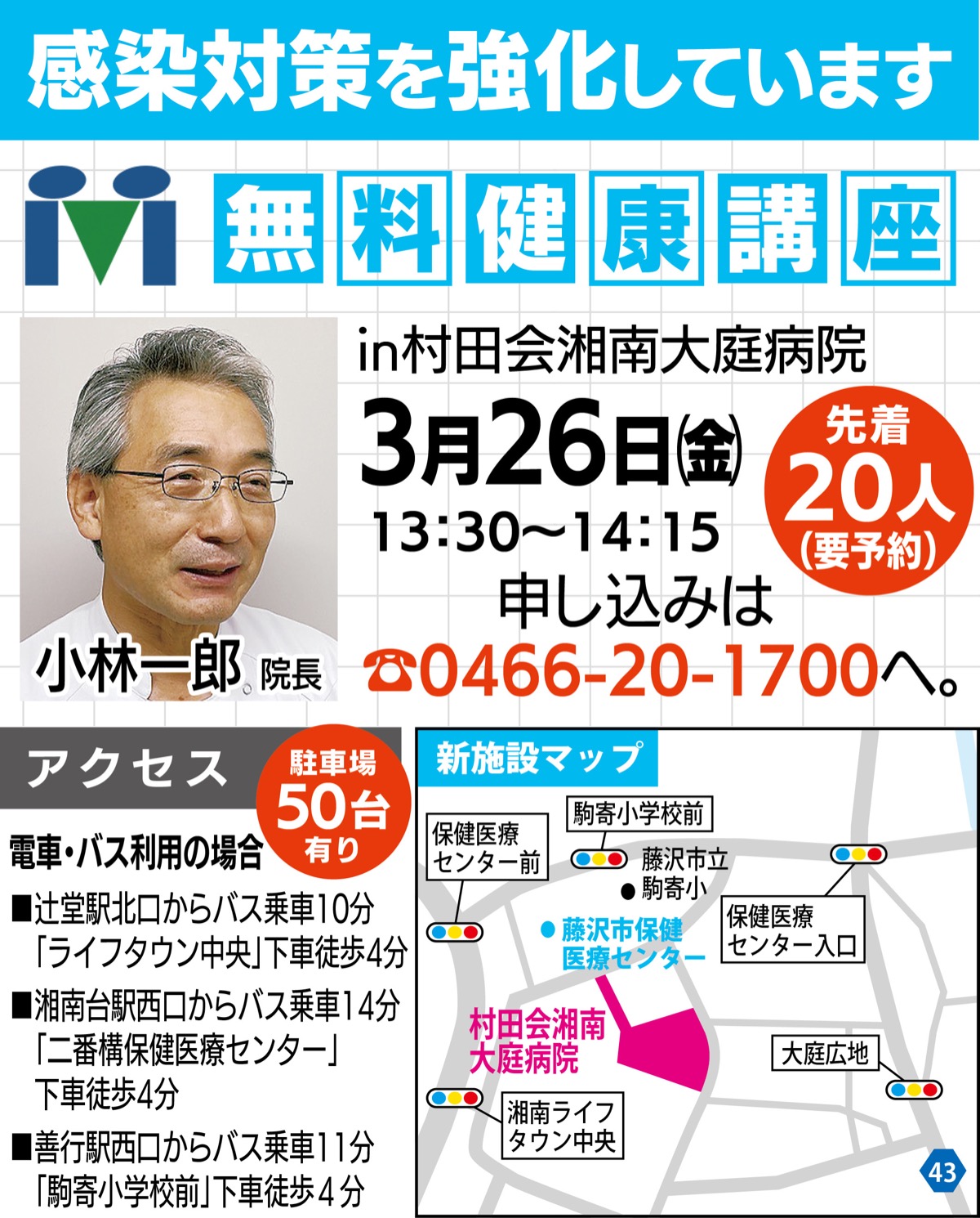 そんな人に向けて、大庭の保健医療センター近くの「村田会湘南大庭病院」では3月26日(金)、同院の小林一郎院長を講師に「睡眠時無呼吸症候群を知ろう」と題した無料健康講座を開催する。