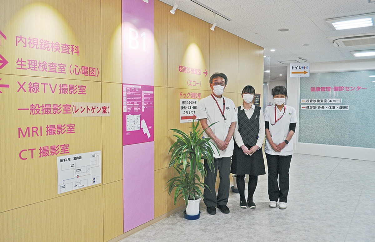 受診場所は、19年12月に設備を拡充した本館地下1階の「健康管理・健診センター」。専門受付を配置し、身長、体重などの基礎データから血液検査、MRI、CT、内視鏡など専門検査までワンフロアで行う。一般外来とは別フロアで待ち時間を過ごし、予約制でスムーズな受診が可能。「健診で何かあれば、すぐに院内での二次検診や他提携医療機関へ紹介できる」と徳山淳病院長。ほか各種定期健診、子宮頸がん検診、人間ドックも実施。