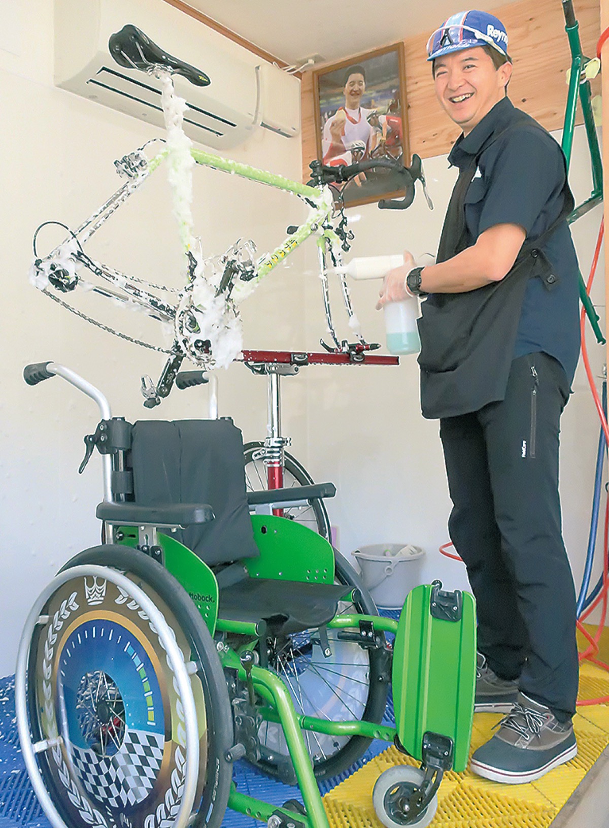 「見ているだけでも気持ちいいでしょう」と笑う石井さん。「自転車の洗車は競技者にはメンテナンスを兼ねた大切な日課の一つ。汚れを取り除くことはもちろん、故障前の小さなトラブルへの対処が不備の事故を遠ざける」と力を込める。