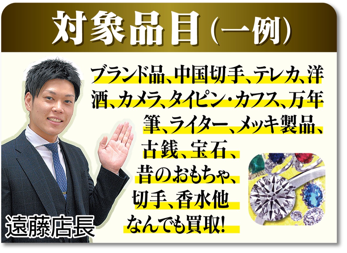 「ブランド品はどんな状態でも必ず買い取ります」と話すのは、全国100店舗以上を展開する「買取店わかば」イオン藤沢店の遠藤尚斗店長。ボロボロで壊れていても、20〜30年前の古い物も対象。「他店で買取不可と言われた金歯、銀歯、メッキ製品、海外製や無刻印の貴金属もお持ち下さい」。それでも「本当に買い取ってくれるの」と疑問に思ったら電話で問い合わせを。
