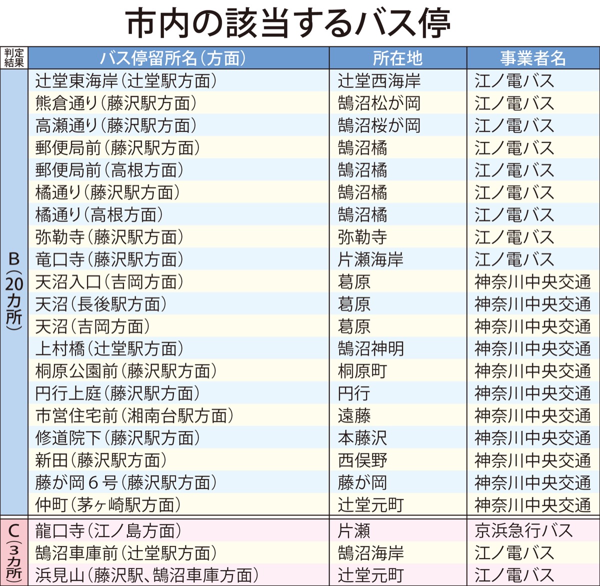 横断歩道や交差点の近くなどに停車し、交通事故を誘発する恐れのある「危険なバス停」について、国土交通省は先月19日、全国の調査結果を公表した。藤沢市内では、対策の優先度を示すABCの三段階で、B判定が20カ所、C判定が3カ所あった。