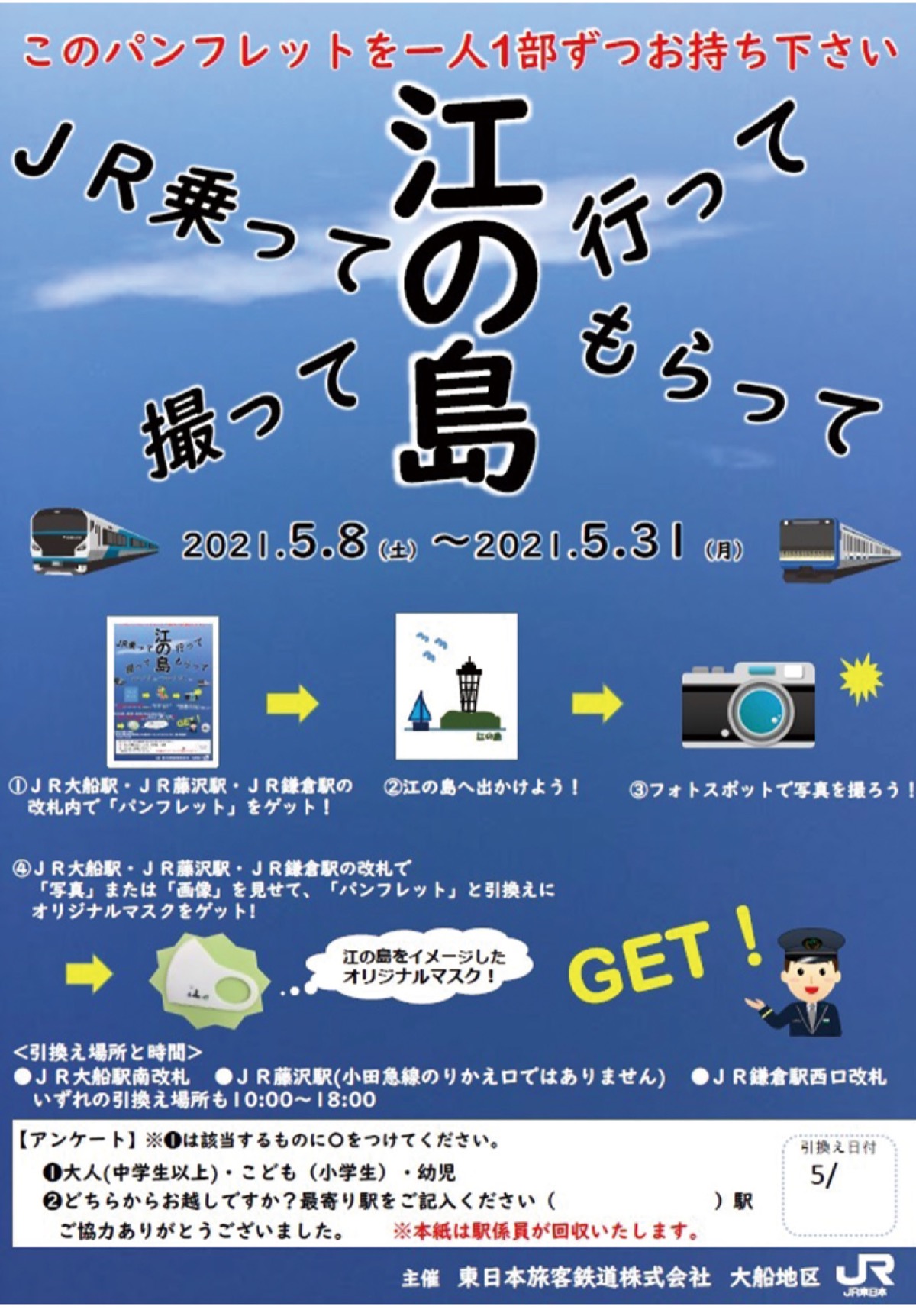 江の島の魅力を再発見してもらおうと、JR東日本横浜支社が「JR乗って 行って 撮って もらって 江の島」イベントを開催している。藤沢駅、大船駅、鎌倉駅のいずれかでパンフレットをもらい、指定された江の島エリアの写真を撮影。指定の窓口で係員に見せ、アンケートに答えるとオリジナルマスクがもらえる。引き換え時間は午前10時から午後6時まで。5月31日までで、無くなり次第終了。問い合わせはJR各駅へ。
