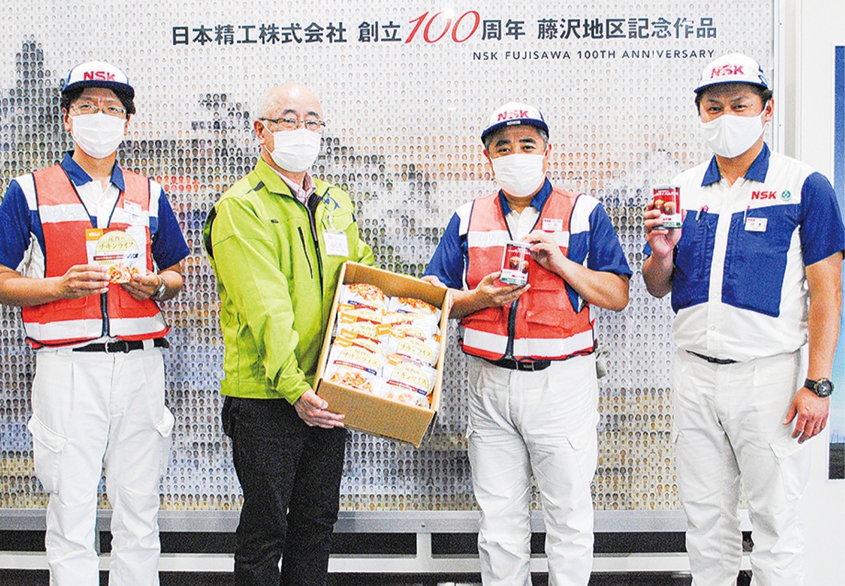 寄付は同工場の賞味期限が近付いた防災備蓄品の入れ替えに合わせて行われた。社会福祉活動をしているNSK労組桐原支部(興邊義人支部長)が橋渡しした。